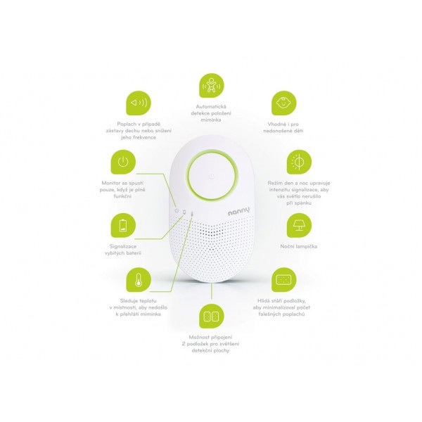 Unikátny produkt od tradičného českého výrobcu monitorov dychu Nanny. Novinka BM-03 je vhodná pre bábätká s nízkou pôrodnou váhou už od 1kg hmotnosti.Nová Nanny BM-03 ponúka jedinečnú funkciu detekcie položenia a odobratia bábätka. Ako jediný produkt na trhu vás dokáže upozorniť, že ste pravdepodobne položili bábätko na podložku, ale zabudli ste monitor zapnúť. Nanny BM-03 je certifikovaný zdravotnícky prostriedok, ktorý monitoruje dýchanie dieťaťa a je vhodný aj pre nedonosené bábätká od 1kg hmotnosti. Ako jediný monitor na trhu si tiež sleduje vek podložky. V prípade, že už prekročila dobu svojej životnosti, upozorní vás na to behom automatického testu funkčnosti pri zapnutí.Nanny je napájaná z 2 tužkových batérií, má nočnú lampičku pre rýchlu vizuálnu kontrolu bábätka v noci a intenzitu jasu automaticky prispôsobuje okolitému prostrediu. Kontrolky v noci svietia s menšou intenzitou pre nerušený spánok vás aj vášho dieťatka.Nanny sleduje i teplotu v miestnosti, aby nedošlo k prehriatiu bábätka, čo je jeden z rizikových faktorov tzv. syndrómu náhleho úmrtia dojčaťa.Detekčnú plochu v postieľke je možné rozšíriť pripojením druhej podložky.Technické parametry:- poplachová frekvencia dýchania: < 8 nádychov/min. (tj. < 0,13 Hz)- priemerná životnosť batérií: 6 mesiacov- snímacia podložka: typ BM-03D, rozmery 300×500×15 mm, váha 935g, povrchový materiál PVC-P- akustický výkon sirény: 80 dB/m ± 5 % dB/m- prevádzkové podmienky: +5 °C až +40 °C, Rh 15 % - 93 %, 700–1200 kPa- použitelnosť snímacej podložky: 2 roky od uvedenia do prevádzky- životnosť zariadenia: 10 rokov za podmienky výmeny snímacej podložky v perióde jej použiteľnosti (tj. 2 roky)- doprava a skladovanie: 0 °C až +70 °C, Rh 10 % - 85 %, 700–1200 kPa- zdravotnícka pomôcka: trieda IIbUpozornenie:Zdravotnícka pomôcka, pozorne si prečítajte návod na použitie a informácie o bezpečnom používaní.BM-03 monitor dychu bábätka je certifikovaná zdravotnícka pomôcka rizikovej triedy IIb, ktorý monitoruje dýchanie dieťaťa. Neslúži k obnoveniu vitálnych funkcií a nie jeani terapeutickým prístrojom. Nenahradzuje riadnu starostlivosť o dieťa. Je určený na použitie u poskytovateľov zdravotnej starostlivosti a na starostlivosť dieťaťa v domácomprostredí. Účelom výrobku je včas upozorniť optickým a akustickým signálom na zástavu alebo pokles frekvencie dýchania. Varuje tak pred prípadným nebezpečenstvom zástavy dýchania, ktorá sa u malých detí môže vyskytnúť napríklad v dôsledku tzv. syndrómu náhleho úmrtia dojčaťa – SIDS, alebo v dôsledku iných príčin (dusenie, prejavy choroby apod.). Z dôvodu povahy a účelu použitia nie sú známe žiadne vedľajšie účinky a iné kontraindikácie.Adresa výrobcu: JABLOTRON ALARMS a.s. Pod Skalkou 4567/33 466 01 Jablonec nad Nisou, e-mail: recepce@jablotron.cz tel.č.: 483 559 811 web: www.jablotron.com IČO: 28668715