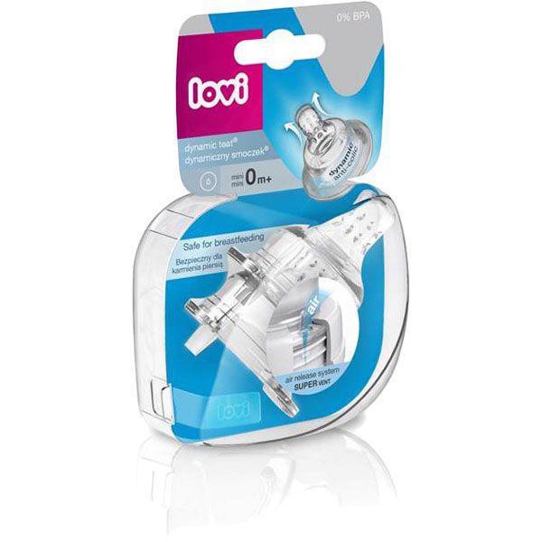 Dynamický cumlík Lovi vyrobený z heterogénnych vrstiev silikónu v priebehu kŕmenia modifikuje svoj tvar (predĺžuje sa), prispôsobuje sa rytmu a sile sania dieťaťa podobne ako matkin prsník pri dojčení.Systém vnútorných otvorov vytvorených podľa modelu laktačných kanálikov reguluje (spomaľuje) prietok pokrmu a stimuluje dieťa k aktívnemu saniu. Umožňuje kombinovať dojčenie a kŕmenie z fľaše.Dynamický cumlík Lovi ovplyvňuje správny vývoj celej ústnej dutiny dieťaťa: - Aktívne sanie - dynamický cumlík a fľaša Lovi sú projektované tak, aby "naučili" dieťa pri saní aktívne pracovať rovnako ako pri dojčení, čo stimuluje správny vývoj celej ústnej dutiny. Profilovaný tvar fľaše LOVI umožňuje správny spôsob držania a fľaša sa môže pohybovať zhodne s rytmom a silou sania dieťaťa.- Vývoj reči - výskumy neurologopedov dokazujú, že aktívne sanie stimuluje miesta, ktoré sa podieľajú na rozvoji reči, dynamický cumlík Lovi umožňuje aktívny tréning týchto miest už od prvých dní života.- Zdravý zhryz - široká, ústami dieťaťa ľahko uchopiteľná základňa cumlíka Lovi sa v priebehu kŕmenia nedeformuje, podporuje rozvoj prirodzeného, správneho zhryzu a vytvára pekný úsmev vášho dieťaťa.- Správne dýchanie - tvar cumlíka Lovi vyžaduje správne priloženie pier a učí dieťa správne dýchať nosom.- Protikolikový cumlík - unikátny systém odvzdušňovania cumlíka minimalizuje možnosť vzniku detskej koliky.Dodáva sa v šiestich veľkostiach prietoku:- mini- pomalý- stredný- rýchly- kaša- variabilnýRozmer balenia a špecifikácie:- v balení 2 kusy