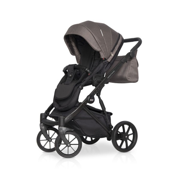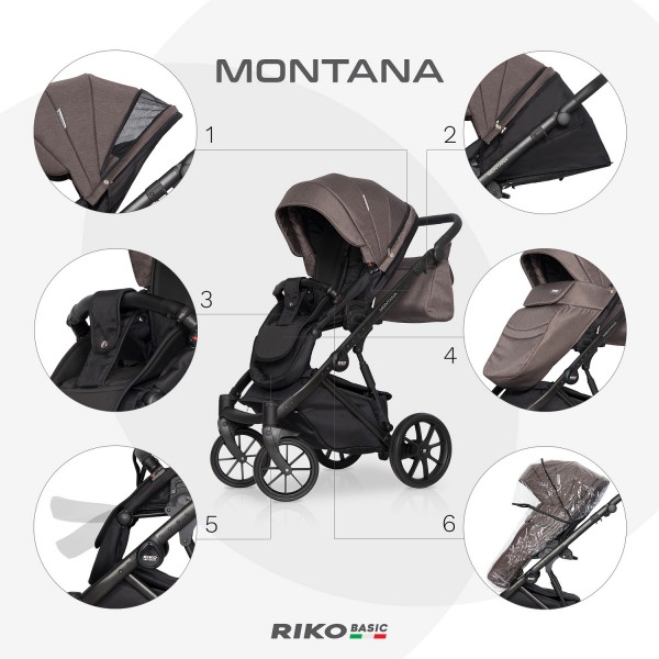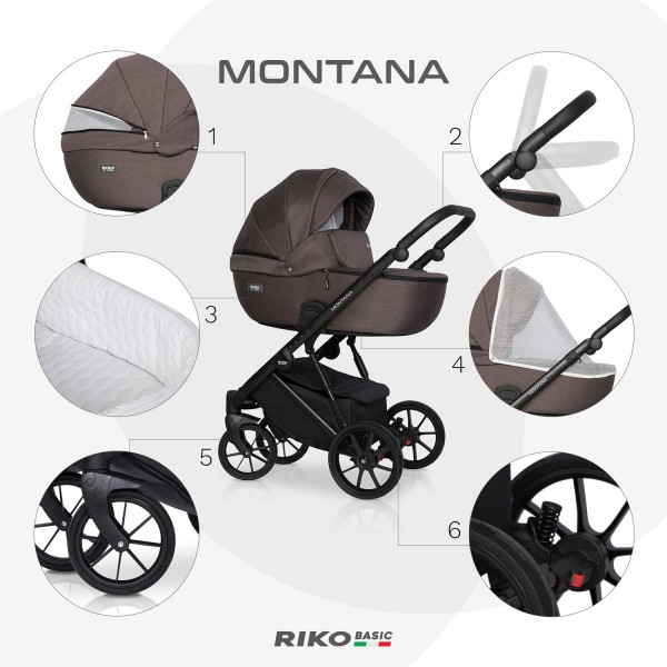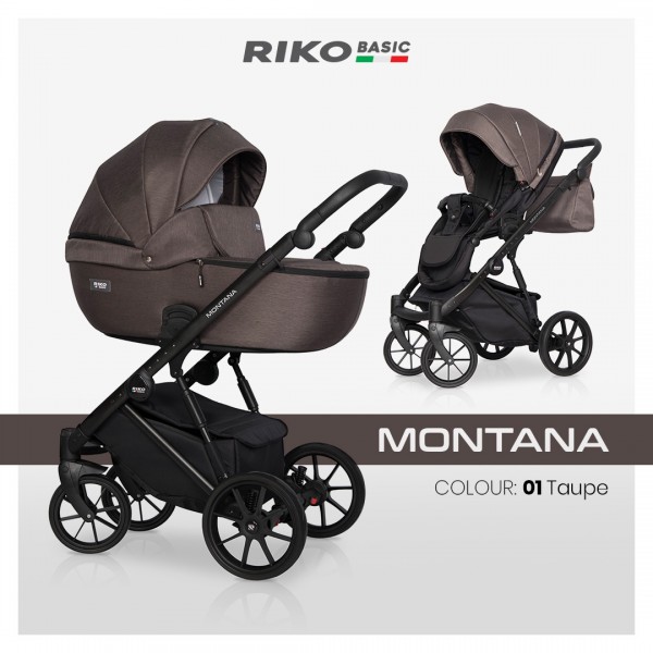 Wózek dziecięcy 2w1 lub 3w1 MONTANA marki RIKO BASIC W odpowiedzi na potrzeby klientów i zmieniające się trendy zakupowe związane z rosnącą popularnością zakupów przez Internet, renomowany Polski producent wózków dziecięcych RIKO wprowadził nową podmarkę o nazwie RIKO BASIC. Jest to seria wózków dziecięcych 2w1 i 3w1 wyprodukowanych w Polsce i przeznaczonych głównie na potrzeby sprzedaży wysyłkowej e-commerce. Wózki z serii RIKO BASIC są tańsze od standardowej oferty marki RIKO dzięki zastosowaniu niższych marż hurtowych i detalicznych. W przeciwieństwie do standardowej oferty, wózki dziecięce RIKO BASIC dostępne są niemalże „od ręki”, co jest przecież tak ważne dla Państwa, gdy decydujecie się na zakup przez Internet. Regularną dostępność i szybki czas realizacji zamówień udało się uzyskać dzięki optymalizacji procesu produkcyjnego. Nie szukaj wózków RIKO BASIC w salonach sprzedaży i pamiętaj, że dokonując zakupu przez Internet masz prawo zwrotu nieużywanego wózka w terminie 14 dni bez podawania przyczyny. Zakup przez Internet jest również bezpieczniejszy ze względu na elektroniczny zapis historii zamówienia. Wózek wielofunkcyjny MONTANA marki RIKO BASIC to nowoczesny wózek dziecięcy charakteryzujący się wysoką jakością wykonania oraz doskonałą amortyzacją. MONTANA posiada aż 3 systemy amortyzacji, z czego 2 posiadają mechanizm umożliwiający regulację twardości. Oprócz standardowej amortyzacji kół przednich i kół tylnych, wózek posiada również dodatkową amortyzację gondoli i siedziska. Posiada ona 2 ustawienia twardości: miękkie dedykowane dla gondoli, gdy Twoje dziecko jest jeszcze malutkie i waży do 9 kg oraz twardsze dla siedziska spacerowego przeznaczone dla dzieci o wadze do 22 kg. Koła w modelu MONTANA posiadają lekkie elastyczne opony z poliuretanu. Poliuretan jest najlepszym tworzywem stosowanym w produkcji opon do wózków dziecięcych. Jest lekki i odporny na różnice temperatur. Dzięki bardzo dużej odporności na ścieranie opony wystarczą na okres dwukrotnie dłuższy niż opony wykonane z gumy i trzykrotnie dłuższy niż tak zwane opony piankowe. Duża gondola z tworzywa sztucznego doskonale sprawdzi się zarówno latem jak i zimą. Posiada system wentylacji oraz regulację oparcia, która doskonale sprawdzi się na przykład gdy zjeżdżasz z wzniesienia i chcesz uniknąć sytuacji, w której główka dziecka jest poniżej linii tułowia lub gdy u dziecka występuje efekt ulewania po posiłku. Wnętrze gondoli oraz materacyk wyściełane są wysokiej jakości bawełną. Materacyk wykonany jest z włókien kokosowych, które charakteryzują się właściwą twardością oraz zapobiegają rozwojowi grzybów i pleśni jednocześnie zapewniając optymalną wentylację. Siedzisko jest przekładane, więc gdy dziecko jest jeszcze malutkie i często zasypia w wózku, możesz ustawić je przodem do siebie i mieć ciągłą kontrolę nad swoim maleństwem. Gdy już trochę podrośnie i będzie bardziej ciekawe świata, obróć siedzisko przodem do kierunku jazdy. Dodatkowy komfort zapewni specjalna wkładka z miękkiej dzianiny. Na chłodne dni producent zadbał o ciepły pokrowiec na nóżki. Duży zamykany koszt na zakupy pod wózkiem i praktyczna torba zawieszana na rączce pomieszczą wszystkie niezbędne podczas spaceru drobiazgi. Nad bezpieczeństwem dziecka czuwają 5-punktowe pasy bezpieczeństwa. Wózek posiada raport z godności z normą EN 1888-1-2:2018 i przeszedł szereg dodatkowych testów wytrzymałościowych. Mimo atrakcyjnej ceny, masz pewność, że kupujesz produkt bezpieczny od renomowanego polskiego producenta. Do wózka możesz zamontować fotelik samochodowy RIKO BASIC za pomocą dołączonych do fotelika adapterów lub zakupić osobno adaptery uniwersalne do fotelików samochodowych innych marek. SPECYFIKACJA WóZKA: - dodatkowa amortyzacja gondoli i siedziska zapewniająca maksymalny komfort, - nowoczesny wózek wielofunkcyjny z możliwością montażu fotelika samochodowego, - lekki aluminiowy stelaż, - duża wygodna gondola z bawełnianą wyściółką i regulacją oparcia, - materacyk kokosowy, - siedzisko w wersji spacerowej z możliwością montażu przodem i tyłem do kierunku jazdy, - regulacja podnóżka, - regulacja oparcia siedziska łącznie z pozycją leżącą, - regulacja budki siedziska, - pokrowiec na nóżki dziecka, - 5-punktowe pasy bezpieczeństwa, - dodatkowy materacyk na siedzisku wykonany z miękkiej dzianiny, - dodatkowy pas krokowy mocowany do barierki bezpieczeństwa, - barierka bezpieczeństwa z możliwością odchylenia na bok, - barierka obszyta praktyczną skórą ekologiczną, - prowadnica wózka obszyta praktyczną skórą ekologiczną, - regulacja wysokości prowadnicy, - duży kosz na zakupy, - łatwy dostęp do kosza na zakupy, - duży praktyczny plecak mocowany na prowadnicy wózka, - pokrowiec przeciwdeszczowy pasujący zarówno do gondoli jak i do siedziska, - moskitiera do gondoli, - innowacyjne łożyskowane koła z oponami z poliuretanu, - system regulacji twardości zawieszenia HDA (Heavy Duty Absorption), - system szybkiego demontażu przednich kół QRS (Quick Release System), - przednie koła samonastawne z możliwością blokady do jazdy prosto, - centralny hamulec postojowy. DANE TECHNICZNE: Rozłożony stelaż z kołami: 59 x 122 x 93 cm Złożony stelaż z kołami: 59 x 86 x 37 cm Zakres regulacji rączki (od ziemi): 65-112 cm Wewnętrzny wymiar gondoli: 20 x 77 x 34 cm Szerokość siedziska: 31 cm Wysokość oparcia: 49 cm Głębokość siedziska: 25 cm Długość podnóżka: 22 cm Średnica kół (przód/tył): 24 / 29 cm Waga stelaż z kołami: 9,00 kg Gondola: 5,80 kg Siedzisko: 5,80 kg Fotelik samochodowy: 3,00 kg