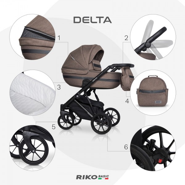 Wózek dziecięcy 2w1 lub 3w1 DELTA marki RIKO BASIC W odpowiedzi na potrzeby klientów i zmieniające się trendy zakupowe związane z rosnącą popularnością zakupów przez Internet, renomowany Polski producent wózków dziecięcych RIKO wprowadził nową podmarkę o nazwie RIKO BASIC. Jest to seria wózków dziecięcych 2w1 i 3w1 wyprodukowanych w Polsce i przeznaczonych głównie na potrzeby sprzedaży wysyłkowej e-commerce. Wózki z serii RIKO BASIC są tańsze od standardowej oferty marki RIKO dzięki zastosowaniu niższych marż hurtowych i detalicznych. W przeciwieństwie do standardowej oferty, wózki dziecięce RIKO BASIC dostępne są niemalże „od ręki”, co jest przecież tak ważne dla Państwa, gdy decydujecie się na zakup przez Internet. Regularną dostępność i szybki czas realizacji zamówień udało się uzyskać dzięki optymalizacji procesu produkcyjnego. Nie szukaj wózków RIKO BASIC w salonach sprzedaży i pamiętaj, że dokonując zakupu przez Internet masz prawo zwrotu nieużywanego wózka w terminie 14 dni bez podawania przyczyny. Zakup przez Internet jest również bezpieczniejszy ze względu na elektroniczny zapis historii zamówienia. Wózek wielofunkcyjny DELTA marki RIKO BASIC to nowoczesny wózek dziecięcy charakteryzujący się wysoką jakością wykonania oraz doskonałą amortyzacją. DELTA posiada aż 3 systemy amortyzacji, z czego 2 posiadają mechanizm umożliwiający regulację twardości. Oprócz standardowej amortyzacji kół przednich i kół tylnych, wózek posiada również dodatkową amortyzację gondoli i siedziska. Posiada ona 2 ustawienia twardości: miękkie dedykowane dla gondoli, gdy Twoje dziecko jest jeszcze malutkie i waży do 9 kg oraz twardsze dla siedziska spacerowego przeznaczone dla dzieci o wadze do 22 kg. Koła w modelu DELTA posiadają lekkie elastyczne opony z poliuretanu. Poliuretan jest najlepszym tworzywem stosowanym w produkcji opon do wózków dziecięcych. Jest lekki i odporny na różnice temperatur. Dzięki bardzo dużej odporności na ścieranie opony wystarczą na okres dwukrotnie dłuższy niż opony wykonane z gumy i trzykrotnie dłuższy niż tak zwane opony piankowe. Duża gondola z tworzywa sztucznego doskonale sprawdzi się zarówno latem jak i zimą. Posiada system wentylacji oraz regulację oparcia, która doskonale sprawdzi się na przykład gdy zjeżdżasz z wzniesienia i chcesz uniknąć sytuacji, w której główka dziecka jest poniżej linii tułowia lub gdy u dziecka występuje efekt ulewania po posiłku. Wnętrze gondoli oraz materacyk wyściełane są wysokiej jakości bawełną. Materacyk wykonany jest z włókien kokosowych, które charakteryzują się właściwą twardością oraz zapobiegają rozwojowi grzybów i pleśni jednocześnie zapewniając optymalną wentylację. Siedzisko jest przekładane, więc gdy dziecko jest jeszcze malutkie i często zasypia w wózku, możesz ustawić je przodem do siebie i mieć ciągłą kontrolę nad swoim maleństwem. Gdy już trochę podrośnie i będzie bardziej ciekawe świata, obróć siedzisko przodem do kierunku jazdy. Dodatkowy komfort zapewni specjalna wkładka z miękkiej dzianiny. Na chłodne dni producent zadbał o ciepły pokrowiec na nóżki. Duży zamykany koszt na zakupy pod wózkiem i praktyczna torba zawieszana na rączce pomieszczą wszystkie niezbędne podczas spaceru drobiazgi. Nad bezpieczeństwem dziecka czuwają 5-punktowe pasy bezpieczeństwa. Wózek posiada raport z godności z normą EN 1888-1-2:2018 i przeszedł szereg dodatkowych testów wytrzymałościowych. Mimo atrakcyjnej ceny, masz pewność, że kupujesz produkt bezpieczny od renomowanego polskiego producenta. Do wózka możesz zamontować fotelik samochodowy RIKO BASIC za pomocą dołączonych do fotelika adapterów lub zakupić osobno adaptery uniwersalne do fotelików samochodowych innych marek. SPECYFIKACJA WóZKA: - dodatkowa amortyzacja gondoli i siedziska zapewniająca maksymalny komfort, - nowoczesny wózek wielofunkcyjny z możliwością montażu fotelika samochodowego, - lekki aluminiowy stelaż, - duża wygodna gondola z bawełnianą wyściółką i regulacją oparcia, - materacyk kokosowy, - siedzisko w wersji spacerowej z możliwością montażu przodem i tyłem do kierunku jazdy, - regulacja podnóżka, - regulacja oparcia siedziska łącznie z pozycją leżącą, - regulacja budki siedziska, - pokrowiec na nóżki dziecka, - 5-punktowe pasy bezpieczeństwa, - dodatkowy materacyk na siedzisku wykonany z miękkiej dzianiny, - dodatkowy pas krokowy mocowany do barierki bezpieczeństwa, - barierka bezpieczeństwa z możliwością odchylenia na bok, - barierka obszyta praktyczną skórą ekologiczną, - prowadnica wózka obszyta praktyczną skórą ekologiczną, - regulacja wysokości prowadnicy, - duży kosz na zakupy, - łatwy dostęp do kosza na zakupy, - duży praktyczny plecak mocowany na prowadnicy wózka, - pokrowiec przeciwdeszczowy pasujący zarówno do gondoli jak i do siedziska, - moskitiera do gondoli, - innowacyjne łożyskowane koła z oponami z poliuretanu, - system regulacji twardości zawieszenia HDA (Heavy Duty Absorption), - system szybkiego demontażu przednich kół QRS (Quick Release System), - przednie koła samonastawne z możliwością blokady do jazdy prosto, - centralny hamulec postojowy. DANE TECHNICZNE: Rozłożony stelaż z kołami: 59 x 122 x 93 cm Złożony stelaż z kołami: 59 x 86 x 37 cm Zakres regulacji rączki (od ziemi): 65-112 cm Wewnętrzny wymiar gondoli: 20 x 77 x 34 cm Szerokość siedziska: 31 cm Wysokość oparcia: 49 cm Głębokość siedziska: 25 cm Długość podnóżka: 22 cm Średnica kół (przód/tył): 24 / 29 cm Waga stelaż z kołami: 9,00 kg Gondola: 5,80 kg Siedzisko: 5,80 kg Fotelik samochodowy: 3,00 kg