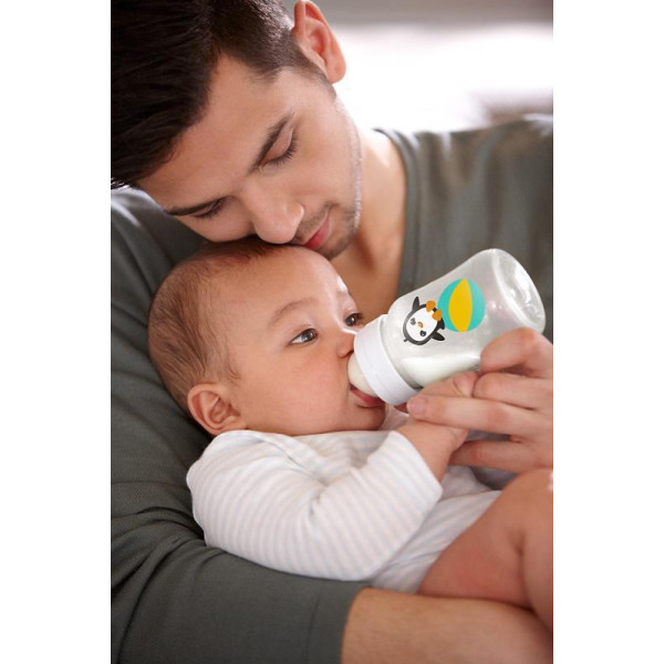 Dojčenská fľaštička s cumlíkom s pomalým prietokom (2 otvory). Čistá, priehľadná, s presnou stupnicou.Používaním dojčenských fliaš AVENT s jedinečným patentovaným silikónovým cumlíkom s ventilom predchádzate hltaniu vzduchu počas kŕmenia a znižujete pravdepodobnosť vzniku koliky.Tvar fľaštičky zaisťuje vysokú stabilitu a pohodlné držanie. Široké hrdlo uľahčuje plnenie fľaštičky aj jej čistenie. Prehľadná presná stupnica pomôže určiť, koľko vaše dieťa vypilo. Viečko tesne prilieha k cumlíku, takže pri premiešavaní stravy alebo cestovaní nedochádza k vylievaniu obsahu fľaštičky.Silikónový cumlík AVENT je navrhnutý tak, aby svojim tvarom a funkciou čo najviac pripomínal mamičkin prsník. Má špeciálny patentovaný okraj, ktorý funguje ako jednosmerný ventil. Cumlík umožňuje prúdenie vzduchu do fľaštičky počas kŕmenia, čím zamedzuje vzniku vákua vo fľaštičke. Dieťa sa nemusí cumlíka pri kŕmení púšťať a môže piť súvisle ako pri dojčení bez prehĺtania vzduchu. Práve prehltnutý vzduch počas kŕmenia vyvoláva plač spôsobený bolestivou kolikou alebo nadúvaním.Klinické pokusy prevedené univerzitami v Londýne a Cambridge preukázali, že novorodenci kŕmení fľaštičkami AVENT trpeli menej kolikami a po prebudení boli spokojnejší než deti, ktoré boli kŕmené z obyčajných fliaš.Široký tvar mäkkého cumlíka núti dieťa zoširoka otvoriť ústa a doslova sa k cumlíku prisať. Môže tak začať sať a používať pritom rovnaké pohyby jazyka a ďasien ako pri dojčení. To je dôvod, prečo je s AVENTOM ľahké kombinovať dojčenie s kŕmením z fľaštičky.Vlastnosti a výhody:- Dojčenská fľaša AVENT využíva ventil, ktorý pracuje prirodzeným reflexom kŕmenia dieťaťa a podporuje zdravé a aktívne kŕmenie.- Bábätko si samo kontroluje prietok mlieka, čím sa znižuje riziko prejedenia a grckania.- Ventil tiež udržuje vzduch mimo bruško bábätka.- Tvar fľaštičky zaisťuje vysokú stabilitu a pohodlné držanie.- Široké hrdlo uľahčuje plnenie fľaštičky aj jej čistenie.- Prehľadná presná stupnica pomôže určiť, koľko vaše dieťa vypilo.- Viečko tesne prilieha k cumlíku Airflex, takže pri premiešavaní stravy alebo cestovaní nedochádza k vylievaniu obsahu fľaštičky.- Klinicky overené zníženie koliky.Klinické pokusy prevedené univerzitami v Londýne a Cambridge preukázali, že novorodenci kŕmení fľaštičkami AVENT trpeli menej kolikami a po prebudení boli spokojnejší než deti, ktoré boli kŕmené z obyčajných fliaš.UPOZORNENIE!- Nepretržité a dlhodobé sanie tekutín spôsobuje zubný kaz.- Vždy skontrolujte teplotu potravy pred podaním.- Pri prvom náznaku poškodenia či opotrebovania produkt odhoďte.- Počas nepouživania udržujte komponenty mimo dosah detí.- Nikdy nespájajte so šnúrami, stužkami, šnúrkami, alebo s voľnýmičasťami odevu, mohlo by dôjsť k uškrteniu dieťaťa.- Nikdy nepoužívajte cumlík na kŕmenie ako bežný cumlík.- Používajte tento výrobok výlučne pod dohľadom dospelých.Neodporúča sa používať mikrovlnnú rúru na zohrievanie detského jedla anápojov. Mikrovlnné žiarenie môže zničiť cenné výživné látky v jedle alebonápojoch. Okrem toho môže spôsobovať nerovnomerné ohriatie. Ak sarozhodnete použiť mikrovlnnú rúru, buďte mimoriadne opatrní a zohriatejedlo alebo nápoje vždy zamiešajte, aby ste zabezpečili rovnomernú teplotu,a pred podávaním teplotu ešte skontrolujte. Do mikrovlnnej rúry vložte lennádobu bez krúžku so závitom, ventilu AirFree, cumlíka a viečka. Nedovoľtedeťom, aby sa hrali s malými dielmi ani aby pri používaní fliaš chodili alebobehali. Na konci kŕmenia vždy vylejte všetko zvyšné materské mlieko. Predkaždým použitím skontrolujte a potiahnite cumlík na kŕmenie všetkýmismermi. Pri prvom náznaku poškodenia či opotrebovania produkt odhoďte.Adresa dodávateľa: Philips Consumer Lifestyle B.V., Tussendiepen 4, 9206 AD Drachten, The Netherlands, PH.CentralRegulatoryOfficer@philips.com