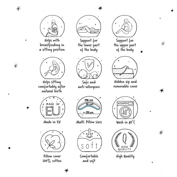 Multifunkčný vankúš Cebuszka Multi pre tehotné, mladých rodičov a deti.Vlastnosti:- Veľký, pohodlný vankúš dopraje relaxáciu, významne zlepšuje komfort fungovania budúcej mamičky a bábätka.- Vankúš Cebuszka Multi je vyplnený polystyrénovými mikroperlami s priemerom 0.5 –1.5 mm, čiže drobnými guličkami, ktoré sa prevaľujú pod vplyvom zmeny polohy tela, jemne masírujú, starajú sa o chrbticu a pohodlie mamičiek a ich detičiek.- Cebuszka Multi pomáha v čase odpočinku a pri spaní s veľkým bruškom. Keď už je dieťatko na svete, uľahčí kŕmenie, uľaví chrbtu a umožňuje zaujať pohodlnú pozíciu pri dojčení.- Cebuszka® Multi je dokonalá na konci tehotenstva, pri kŕmení dieťaťa, ako aj pri ďalšom učení sa ako sedieť, čím vytvára stabilnú podporu.- Poťah na vankúš je mimoriadne odolný a dlhotrvajúci.- Odopínateľný poťah vankúša zaručuje jeho ľahkú údržbu vďaka možnosti prania v práčke. Je certifikovaný Öko-Tex Standard 100.Materiálové zloženie:Poťah: 100 % žersejVýplň: EPS mikroperličkycertifikovaný Öko-Tex Standard 100.Rozmery: dĺžka/ výška – 190 × 35 cmOdporúčame dodržiavať pracie symboly uvedené na etikete výrobku.