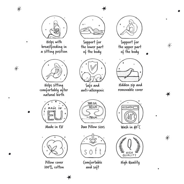 Cebuška DUO – multifunkčný vankúš je určený pre tie najnáročnejšie mamičky na svete. Je to najväčší vankúš pre tehotné ženy a dojčiace matky. Jeho inovácia spočíva v dvojdielnej konštrukcii a použití dvoch rôznych výplní.Prvá časť, ktorá slúži ako vankúš pod hlavu, je vyplnená mäkkým polyesterovým vláknom potiahnutým silikónom. V druhej, hlavnej a dlhšej časti sa nachádzajú mikroperličky, ktoré sa okrem iného používajú pri vankúšoch na rehabilitáciu, pretože sa prispôsobujú tvaru ľudského tela. Vďaka jedinečnému dizajnu vankúš Cebuška DUO poskytuje stabilnú oporu pre celé telo a príjemný odpočinok počas tehotenstva a dojčenia detí. Cebuška DUO má tvar veľkého písmena „C“ a rozmery: d./v. 300 × 30 cm. Je certifikovaný podľa Oeko-Tex Standard 100.Technické parametre:- rozmery: 300 × 30 cm- materiál: poťah: 100 % jersey, výplň: duté vlákno a EPS mikroperličkyVarovanie:1. Nezanechávajte dieťa bez dozoru: nikdy nezanechávajte dieťa bez dozoru na vankúši. Vankúš je určený na podporu dojčenia, ale nemal by byť použitý ako miesto na zanechanie dieťaťa bez dozoru. Dieťa sa môže náhodne prevrátiť alebo zmeniť polohu, čo môže viesť k uduseniu alebo pádu.2. Prestaňte používať v prípade poškodenia: ak vankúš vykazuje známky poškodenia, ako sú trhliny v materiáli, praskliny alebo iné štrukturálne vady, okamžite prestante vankúš používať. Trhlina môže spôsobiť únik výplne, čo predstavuje bezpečnostné riziko pre dieťa aj matku.3. Nepoužívajte vankúš ako náhradu za postieľku alebo autosedačku: vankúš nie je určený na spanie dieťaťa ani na prepravu. Nikdy nepokladajte dieťa na vankúš na noc ani ho nepoužívajte v autosedačke. Dieťa vždy umiestnite na bezpečné miesto, ako je postieľka alebo autosedačka, v súlade s odporúčaniami výrobcu.4. Bezpečné používanie počas dojčenia: uistite sa, že vankúš je správne umiestnený, aby poskytol pohodlie a podporu matke aj dieťaťu. Nesprávne umiestnenie vankúša môže viesť k nesprávnej pozícii počas dojčenia, čo môže spôsobiť bolesť chrbta alebo problémy s dojčením. Vždy dojčite dieťa na bezpečnom a stabilnom mieste, aby ste sa vyhli riziku náhodného pádu.5. Vyhnite sa nadmernému zaťaženiu vankúša: používajte vankúš podľa jeho určenia. Nadmerné zaťaženie vankúša, napríklad umiestnenie iných predmetov naň, môže poškodiť vankúš a znížiť jeho účinnosť.6. Správna starostlivosť o produkt: vankúš pravidelne čistí v súlade s pokynmi. Pred opätovným použitím sa uistite, že vankúš je úplne suchý.Dôležité: Pred každým použitím vždy skontrolujte stav vankúša, aby ste zaistili maximálnu bezpečnosť a pohodlie pre vás a vaše dieťa.Adresa výrobcu: Ceba sp. z o. o. Fabryczna 1. 56-400 Olesnica, Poland. Email support@ceba.com.pl