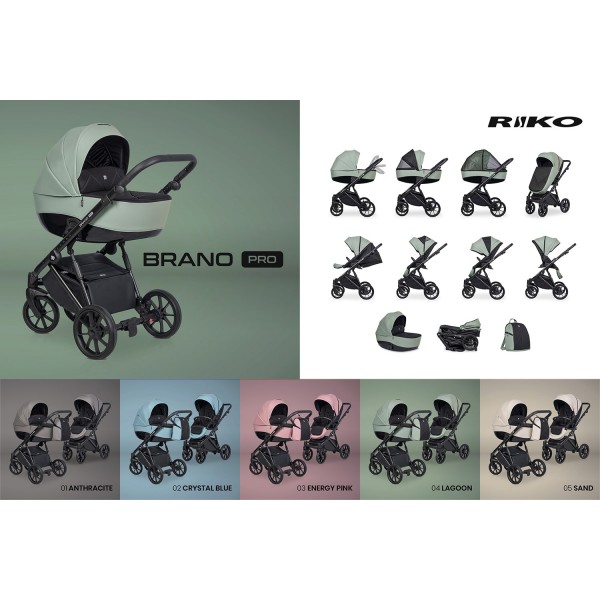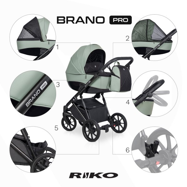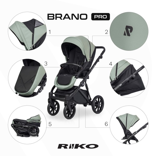 Riko Brano Pro je multifunkčný kočík, ktorý obsahuje konštrukciu, vaničku, športovú sedačku. Je to kočík 2 v 1. Okrem toho je možné dokúpiť autosedačku Cosmo 0+ / od 40-87 cm, certifikácia ECE R129 I-SIZE / dokupuje sa v cene 102€ a vytvoriť si kočík 3v1 alebo pomocou vhodných adaptérov sa môžu pripevniť aj autosedačky iných značiek * (* o podrobný zoznam požiadajte predajcu).