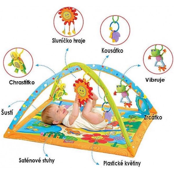 Krásne farebná deka TINY LOVE s veselými obrázkami a skrytými aktívnymi prvkami. Na deku sa inštalujú dve hrazdy, na ktorých sú zavesené hračky. Deka rozvíja všetky zmysly dieťaťa zábavnou formou. Rozmer: 84 × 75 cm.Rozmer balenia a špecifikácie:- Pre koho: pre dievčatko, pre chlapčeka- Pre vek: 0-3 mesiace, 3-6 mesiace- Hudba: Nie- Deka s hrazdou: ano- Rozmer: 84 x 75 cm