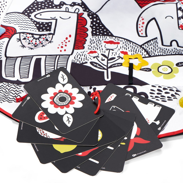 Kontrastná senzorická deka 4SMART so 4 senzorickými zónami, ktoré podporujú vývoj dieťaťa. Určená je pre deti od prvých mesiacov života. Deti v prvých mesiacoch svojho života vidia iba kontrastné farby. S cieľom povzbudiť predstavivosť bábätka a podporovať jeho vývoj už od prvých mesiacov sme vytvorili deku 4SMART s výraznými, kontrastnými farbami. 4SMART má 4 zóny, ktoré rozvíjajú: zrak, hmat, sluch a sústredenosť. 1. zóna rozvíja zrak: pozostáva z kontrastných farieb - čiernej, bielej a červenej so žltými prvkami. Má farebné pásky, ktoré priťahujú pozornosť dieťaťa a pomáhajú mu rozlišovať farby. 2. zóna rozvíja sluch: má šuštiace a hrkotajúce prvky, ktoré drobca zaujmú rôznymi zvukmi. Dieťa ich môže slobodne krčiť a dotýkať sa.3. zóna rozvíja hmat: sú tam vyčnievajúce prvky s rôznymi textúrami, vďaka ktorým stimuluje dieťa svoj hmatový zmysel a spoznáva nové faktúry a tvary. 4. zóna pomáha deťom cvičiť sústredenosť: podložka má špeciálne miesto, kde sa dajú vložiť kontrastné karty a zrkadlo. Tieto prvky upútavajú pozornosť dieťaťa a učia ho sústrediť.Balenie obsahuje 2 hrazdičky s pohodlným posuvníkom, môžete naň umiestniť a ľubovoľne presúvať priložené hračky: 12 poznávacích kariet 4SMART, visiace zrkadlo, visiaca loptička s hrkálkou, visiaca šuštiaca hračka, senzorická lopta, plyšová hračka, farebné pásky, hrkotajúce guľôčky a zrkadlo, ktoré sa dá umiestniť za fóliou. Karty môžete zavesiť napr. na kočík alebo batoh. Okrem toho je súčasťou balenia aj senzorická lopta. Je veľká, má rôzne farby, tlačidlá a vzory, vďaka čomu upúta zrak drobca a prinesie mu veľa radosti. Vďaka zaujímavému vzoru a štylistike ako aj multifunkčnosti je to deka ideálna pre každé dieťa. Funkčnosť:- bola navrhnutá pre najmladšie deti, ktoré ešte nerozpoznávajú farby a vidia hlavne kontrasty. Práve preto sú hlavné farby podložky intenzívne farby: čierna, biela a červená so žltými prvkami.- má 4 zóny, ktoré rozvíjajú:1 zrak: zóna s kontrastnými farbami. Je vo farbách, ktoré priťahujú zrak a pozornosť dieťaťa.2 sluch: šuštiace a hrkotajúce prvky, ktoré priťahujú pozornosť dieťaťa 3 hmat: zóna s vyčnievajúcimi prvkami (šnúrky a loptičky) s rôznou textúrou, aby si ich mohlo dieťa dotýkať a takto stimulovať svoj hmatový zmysel,4 sústredenosť- súčasťou balenia sú mnohé hračky, ktoré povzbudzujú zmysly: 12 kontrastných kariet, visiace zrkadlo, visiaca loptička s hrkálkou, visiaca šuštiaca hračka, senzorická lopta, plyšová hračka, farebné pásky, hrkotajúce guľôčky a zrkadlo, ktoré sa dá umiestniť za fóliou.- karty môžete so sebou zobrať na prechádzku – karty 4SMART majú špeciálny háčik, pomocou ktorého možné ich zavesenie napr. na kočík.- balenie obsahuje tiež veľkú senzorickú loptu, ktorá povzbudí predstavivosť drobca a prinesie mu veľa radosti.- vďaka zaujímavému vzoru a prevedeniu je ideálna pre každé malé dieťa. - deka je tiež ideálna ako darček - je multifunkčná, a má aj krásny obal. Navyše je to praktický darček: rozvíja zmysly dieťaťa, povzbudzuje jeho predstavivosť a bude drobcovi slúžiť dlhé roky.Pohodlie:- má nastaviteľné hrazdičky a visiace hračky sa dajú jednoducho presúvať a umiestňovať na ľubovoľnom mieste.- je ľahká a dá sa jednoducho zvinúť (po odstránení hrazdičiek). Bez problému ju so sebou zoberiete na dovolenku!- podložka sa veľmi jednoducho čistí. Základ deky je možné prať ručne, a ostatné hračky ľahko vyčistíte handričkou.Bezpečnosť:- senzorická deka 4SMART dobre izoluje od podlahy.- je vhodná pre deti už od prvých dní života - spĺňa normy EN 71-1, EN 71-2, EN 71-3 pre hračky a vzdelávacie podložky.- bola vyrobená s výnimočnou starostlivosťou - pevné zošitie a žiadne vyčnievajúce prvky, ktoré by sa dali ľahko odtrhnúť, zvyšujú bezpečnosť drobca.Materiály:- podložka: polyester- hračky: polyester, plast- karty: papierRozmery:- 128 x 116 cm- výška od podlahy do hrazdičiek 46,5 cm- rozmery podložky s rozloženými bokami: 126 x 112- rozmery podložky so zloženými bokami: 75 x 75- rozmery kariet: 12 x 19- hmotnosť: 1,1 kg- rozmery balenia/hmotnosť: 65 x 46 cm x 10 cm/1,6 kg(SK) UPOZORNENIE! Nikdy nenechávajte dieťa bez dozoru. Nenechávajte výrobok v blízkosti otvoreného ohňa alebo iných zdrojov tepla. POZOR! Nikdy neklaďte výrobok na vyvýšenie, napr. stôl - hrozí nebezpečenstvo. Z bezpečnostných dôvodov nenechávajte v dosahu detí voľne dostupné časti balenia (plastové tašky, kartóny atď.) Nebezpečenstvo udusenia!Adresa dodávateľa: Supl4kraft sp. z o.o.ul. Tatrzanska 1/5,60-413 Poznan, Polandsupport@kinderkraft.comwww.kinderkraft.com