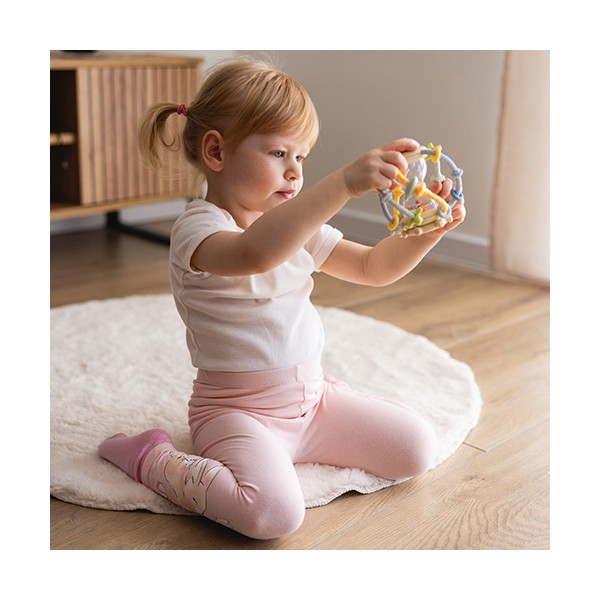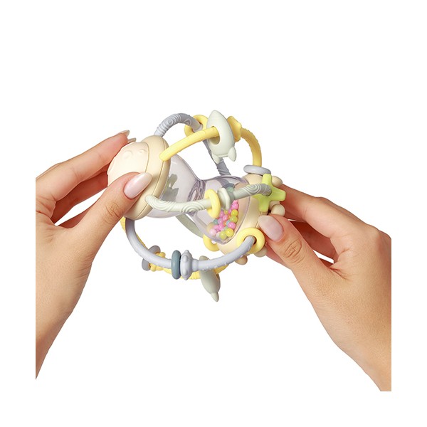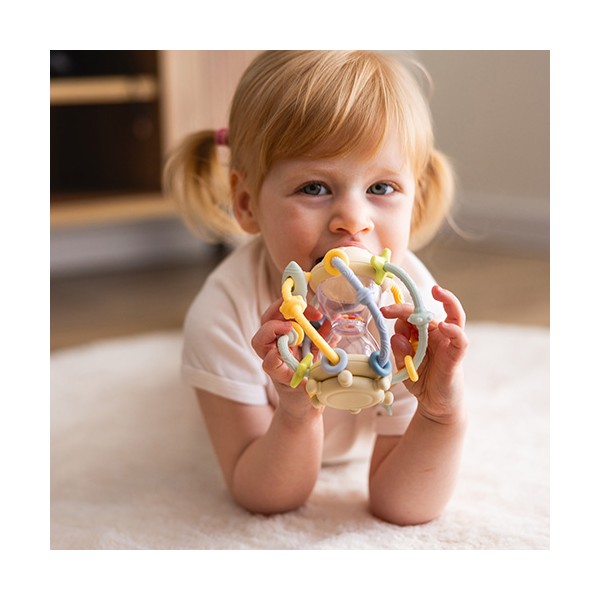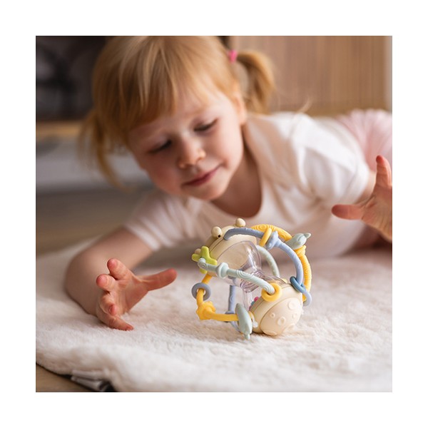 Senzorická hračka v tvare presýpacích hodín – hryzačka a hrkálka v jednom. Táto junikátna hračka spája mäkkú hryzačku a stimulačnú hrkálku. Bola navrhnutá s ohľadom na zvedavosť bábätiek – perfektne padne do malých rúk a ponúka mnoho možností na objavovanie. Farebná hryzačka s jemnými výstupkami upokojuje ďasná počas prerezávania zúbkov, zatiaľ čo priesvitné presýpacie hodiny s farebnými guľôčkami jemne hrkajú a priťahujú pozornosť. Vaše dieťa môže posúvať pohyblivé prvky po silikónových oblúkoch, sledovať guľôčky v presýpacích hodinách či otáčať kolieskom na spodku hračky, ktoré vydáva príjemný zvuk. Hračku je z netoxického silikónu a plastu PP, takže je bezpečná na hru už od prvých mesiacov života.Vlastnosti:- Jemná hrkálka – vydáva decentné zvuky, ktoré nepodráždia, ale stimulujú zmysly dieťaťa- Hryzačka s výstupkami – pružné oblúky a mäkké nopy jemne masírujú ďasná a prinášajú úľavu pri prerezávaní zúbkov- Efekt presýpacích hodín – farebné guľôčky vo vnútri vytvárajú fascinujúci pohyb a učia dieťa vzťahu príčina–následok- Otoč a počúvaj – malé koliesko na spodku pri otáčaní vydáva príjemný zvuk a je ďalšou atraktívnou funkciou- Ergonomický tvar – špeciálne prispôsobený malým ručičkám, umožňuje ľahké uchopenie, trasenie a otáčanie- Podpora rozvoja – hračka stimuluje zmysly, rozvíja koordináciu ruka–oko a podporuje samostatné objavovanieTechnické údaje:- Silikónové oblúky s mäkkými výstupkami- Presýpacie hodiny s hrkajúcimi guľôčkami- Zvukové koliesko na spodku hračky- Materiál: silikón bez BPA, plast PP- Vek dieťaťa: 0 m+Rozmer balenia: 12,5 x 10 x 11 cmDôležité: Pred prvým použitím prelejte výrobok vriacou vodou (nevariť!) a nechajte vysušiť. Na denné čistenie odporúčame umývať v teplej vode s pridaním detského mydla, dôkladne opláchnuť a osušiť. Odstráňte všetky bezpečnostné prvky, ktoré by mohli byť pre dieťa nebezpečné. Pred použitím vždy skontrolujte stav hračky – používať sa smie len nepoškodený výrobok. Pri prvých známkach poškodenia hračku zlikvidujte. Používajte len pod dohľadom dospelej osoby. Hračka je v súlade s normou EN 71. Obal si uschovajte na informačné účely, no uchovávajte ho mimo dosahu detí. Obal ani upevňovacie prvky nie sú súčasťou hračky a môžu byť nebezpečné.Adresa dodávateľa: Babyono sp. z o.o., Kowalewicka 13, 60-002 Poznań, Poland. +48 61 83 90 520, info@babyono.pl, www.babyono.com