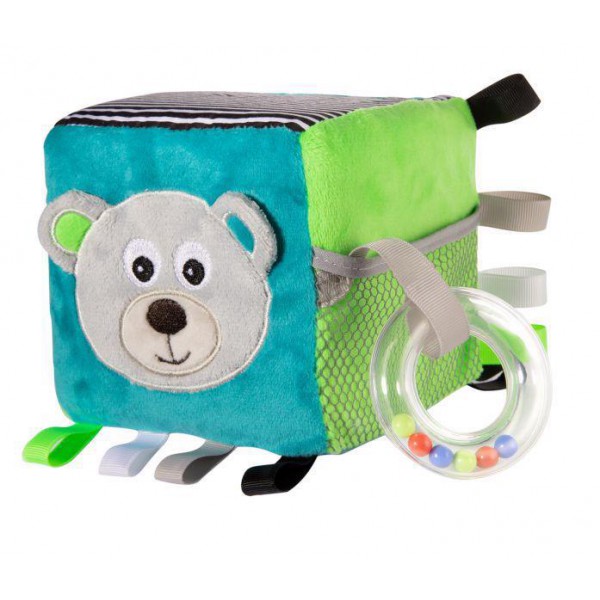 Plyšová senzorická kocka z kolekcie MEDVEDÍKY je vhodná pre deti už od 0 mesiacov. Hračka je vyrobená z rôznych textúr materiálov, ktoré stimulujú hmat dieťaťa. Zvoniaci a šuštiaci prvky skvele budí u dieťaťa pozornosť. Kocka disponuje rôzne farebnými stuhami, ktoré povzbudzujú dieťa hračku uchopiť. Z jednej strany je hračka zdobená čierno-bielymi prúžkami, tie sú najužitočnejšími pomocníkmi pre rozoznávanie farieb u tých najmenších detí. Súčasťou hračky je tiež elastické hryzátko slúžiace ako ukľudňujúca pomôcka pri svrbenie ďasien.