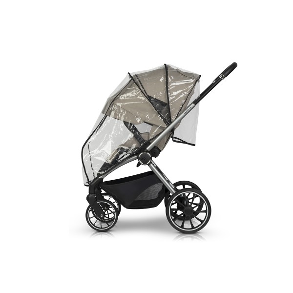Set s kočíkom obsahuje módnu a praktickú tašku s upevňovacím systémom na madlo kočíka, návlek na nohy do chladných dní a pláštenku.
