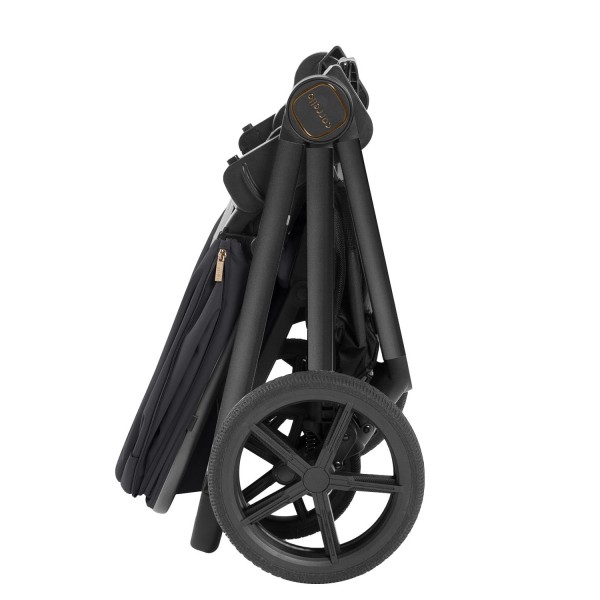 Hliníkový rám s elegantným povrchom, skladací systém typu book fold. Kočík po zložení stojí vertikálne bez kontaktu textilu so zemou.