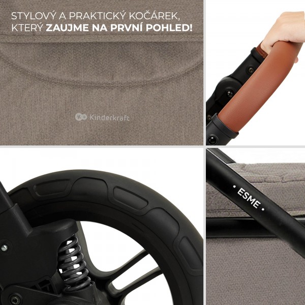 Vneste štýl do svojich každodenných prechádzok!ESME je multifunkčný detský kočík 3 v 1, ktorý vás očarí svojou funkčnosťou a eleganciou. Zaujmete pozornosť krásnym, moderným dizajnom – decentné farebné prevedenie a starostlivo spracovaný rám zaistia, že si každodenné prechádzky s dieťaťom zamilujete ešte viac. Kočík oceníte aj vďaka veľkej vaničke s ventilačným panelom, ktorú v troch jednoduchých krokoch premeníte na športové sedadlo. Toto riešenie 2 v 1 vám ušetrí miesto pri skladovaní jednotlivých častí.Za zmienku stoja aj ďalšie praktické riešenia, ako je skladanie do kompaktných rozmerov spolu so sedadlom alebo cestovný systém – TRAVEL SYSTEM (autosedačka MINK PRO 2 i-Size a adaptéry sú súčasťou balenia). Kočík 3 v 1 ESME má aj veľké odpružené kolesá z neprepichnuteľnej TPE gumy – sú ľahké, otočné a vhodné do každého terénu. ESME vás spoľahlivo sprevádza na každodenných prechádzkach aj na dlhších dovolenkách. V balení nájdete kompletnú sadu potrebného príslušenstva – bez ďalších nákladov! Užívajte si pohodlné prechádzky vďaka priestrannej taške, pláštenke, nánožníku a držiaku na pohár.Multifunkčný kočík 3 v 1 až do 25 kgESME je praktický kočík 3 v 1 s celkovou nosnosťou až 25 kg. Má pevný rám a funkčné sedadlo 2 v 1, ktoré ľahko premeníte z vaničky na športovú verziu. Súčasťou balenia je aj kompletné príslušenstvo, adaptéry a detská autosedačka.Jednoduché ovládanieESME sa veľmi ľahko ovláda, a preto si poradí aj v preplnených priestoroch. Konštrukcia v kombinácii s otočnými kolesami uľahčuje manévrovanie. Predné kolesá môžete na náročnejšom povrchu zablokovať pre jazdu priamo. Kočík sa navyše jednoducho zloží do kompaktných rozmerov – a to aj so sedadlom! Či už idete na hory alebo k moru, ESME je pripravený na každú výzvu.Kompletné príslušenstvoSúčasťou balenia je autosedačka MINK PRO 2 i-Size (40–87 cm) s adaptérmi, ktoré umožňujú vytvoriť cestovný systém (TRAVEL SYSTEM). Okrem toho získate držiak na pohár, univerzálny nánožník, pláštenku a tašku na rukoväť.Veľká vanička s ventilačným panelomESME bol navrhnutý pre pohodlie každého dieťaťa. Pre najmenších je pripravená priestranná vanička s ventilačným panelom a veľkou strieškou s okienkom na kontakt s dieťaťom. Vanička je mäkká a pohodlná – ideálna na spánok na čerstvom vzduchu.Jednoduchá premena z vaničky na športové sedadloPraktické sedadlo 2 v 1 umožňuje rýchlu a jednoduchú premenu vaničky na športovú verziu. Stačia tri kroky a kočík pre novorodenca sa premení na kočík pre staršie dieťa. Nemusíte hľadať zvláštne miesto na skladovanie ďalšej časti, keď dieťa z vaničky vyrastie.TRAVEL SYSTEMESME je navrhnutý tak, aby vám uľahčil spoločné prechádzky aj cestovanie. V balení preto nájdete adaptéry a autosedačku MINK PRO 2 i-Size – vďaka nim vytvoríte TRAVEL SYSTEM, ktorý oceníte na cestách. Dieťa zaspalo v aute? Žiadny problém: vyberte autosedačku, nacvaknite ju na rám kočíka – a môžete pokračovať! Autosedačka MINK PRO 2 i-Size je model RWF (proti smeru jazdy) pre najmenšie deti. O bezpečnosť pasažiera sa starajú pokročilé systémy ako H-GUARD+ a SPS+. Poloha RWF je navyše až 5× bezpečnejšia ako poloha po smere jazdy.Široké možnosti nastavenia športovej verzieESME je pohodlný aj pre staršie deti: športové sedadlo je dlhé a široké, takže poslúži aj predškolákom do cca 4 rokov. Sedadlo ľahko nastavíte podľa potrieb dieťaťa – k dispozícii je poloha v sede aj pololežmo, ideálna na krátky odpočinok. Nastaviteľná je aj rukoväť pre rodičov, takže si kočík pohodlne prispôsobíte.Veľké kolesá do každého terénuESME má veľké neprepichnuteľné kolesá s plným odpružením – sú vyrobené z ľahkej a odolnej TPE gumy. Nie je potrebné ich nafukovať, čo je veľkou výhodou na dlhších cestách. Hodia sa do každého terénu – od chodníkov až po lesné cesty.Praktické riešeniaKočík 3 v 1 ESME má veľkú striešku s okienkom pre kontakt s dieťaťom, ktorá chráni pred vetrom aj slnkom. Pod sedadlom sa nachádza priestranný košík s nosnosťou až 3 kg – ideálny na nákupy alebo nevyhnutné doplnky. O bezpečnosť dieťaťa sa starajú nastaviteľné 5-bodové pásy s mäkkými polstrami a odnímateľné madlo, ktoré možno otvoriť z oboch strán.Elegantný dizajnESME si môžete prispôsobiť podľa vlastného štýlu: je dostupný v 3 moderných farbách. Mäkký materiál a elegantné povrchové spracovanie mu dodávajú štýlový vzhľad na každej prechádzke.Materiály- Rám: oceľ- Kolesá: TPE guma- Madlo a rukoväť: eko koža- Poťah: polyesterRozmery- Rozložený kočík: 100 × 60 × 102,5 cm- Zložený kočík: 72 × 60 × 40 cm- Rozmery sedadla: 19 × 35 cm- Rozmery operadla: 41 × 35 cm- Rozmery opierky nôh: 19 × 35 cm- Celková dĺžka sedadla v ľahu: 79 cm- Výška sedadla od zeme: 55 cm- Priemer predných kolies: 18 cm (8”)- Priemer zadných kolies: 25 cm (11”)- Výška po rukoväť: 102,5 cm- Rozmery vaničky (vonkajšie): 35 × 21 × 81 cm- Rozmery vaničky (vnútorné): 34 × 20 × 79 cm- Hmotnosť rámu: 8 kg- Hmotnosť sedadla: 2,45 kgRozmery balenia: 48 × 70,5 × 51 cmDôležité: Kočík pred použitím vždy kompletne zaistite podľa návodu. Neprekračujte maximálnu nosnosť. Kočík používajte na rovnom, bezpečnom povrchu. Vanička je určená na krátkodobé prenášanie dieťaťa – nikdy ju nenoste so samotným dieťaťom bez neustáleho dohľadu.Adresa dodávateľa: Supl4kraft sp. z o.o. ul. Tatrzanska 1/5, 60-413 Poznan, Poland support@kinderkraft.com www.kinderkraft.com