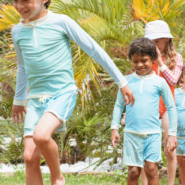 ICONIK plavecké tričko s dlhým rukávom s UV ochranou je nevyhnutnou výbavou na leto pre najmenších. Kombinuje štýl, pohodlie a ochranu pred slnkom krehkej detskej pokožky na suchu aj vo vode. Je ideálne na pláž, k bazénu alebo počas outdoorových aktivít. Vďaka ochrannému faktoru UPF 50+ poskytuje ochranu pred UV žiarením. Najvyšší index ochrany UPF 50+ (blokuje až 98 % UVA a UVB lúčov). Recyklovaný polyester s certifikátom GRS (Global Recycled Standard) a spandex. Certifikát Oeko-Tex. Ľahko odstrihnuteľný štítok. Recyklovateľné balenie. UV senzor. UV senzor Aby sme aj deti zapojili do ich ochrany pred slnkom, na tričko sme umiestnili UV senzor, ktorý mení farbu v závislosti od intenzity UV žiarenia (čím je viac fialový, tým je UV žiarenie intenzívnejšie a je potrebná vyššia ochrana pred slnkom). Zloženie Overal je vyrobený z 82% recyklovaného polyesteru a 18% spandexu, čím zaisťujú flexibilitu a pohodlie, zatiaľ čo podšívka (92 % polyester, 8 % spandex) zaručuje mäkký a príjemný pocit na pokožke. Balenie Pre celú radu plaviek a ponč ICONIK je obal inšpirovaný originálnym balením slnečných okuliarov KiETLA. Okrúhly otvor na papierovom balení vám umožňuje vyskúšať materiál a vidieť jeho farbu. Plavky s dlhým rukávom sú dostupné v 3 veľkostiach: 2-4 roky. 4-6 rokov. 6-8 rokov. Veľkostnú tabuľku nájdete tu . Údržba: Odolné voči slanej vode aj chlóru. Pranie pri teplote 30°C. Nesušte v sušičke, nežehlite, nepoužívajte zmäkčovadlo.