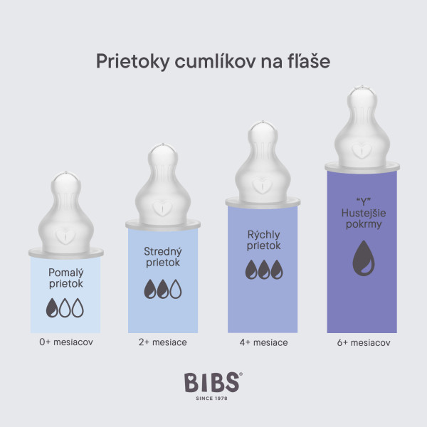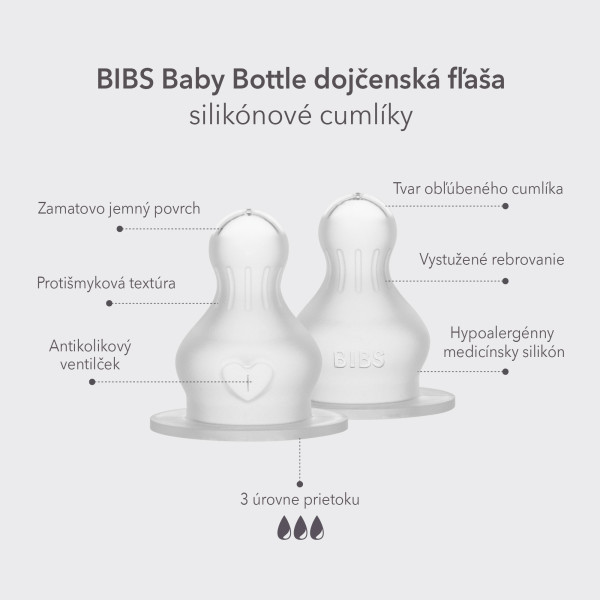 Silikónové cumlíky určené na BIBS dojčenské fľaše. BIBS fľaše sú zárukou, že bábätká prídu pri kŕmení do kontaktu len s kvalitným prémiovým a bezpečným materiálom a ich bruško bude aj vďaka unikátnemu antikolikovému ventilu kľudné a bábätká spokojné. Ultramäkký hypoalergénny silikónový cumlík s extra rýchlym prietokom je pre bábätká pripravené ochutnávať hustejšie príkrmy, kaše alebo smoothies. Starostlivo navrhnutý s otvorom v tvare Y, ktorý prispôsobuje prietok sile sania vášho dieťaťa. Unikátny antikolikový ventil v tvare srdiečka zabráni, aby sa do bruška bábätka dostával vzduch a napomáha tak pokojnému kŕmeniu bez bolesti bruška a výskytu kolík. Okrúhly tvar cumlíka, ktorý deti poznajú u BIBS Colour cumlíkov. Hypoalergénny cumlík zo 100% medicínskeho silikónu. Vystužené rebrovanie pre väčšiu odolnosť cumlíka a protišmyková textúra pre plynulé sanie. Unikátny antikolikový ventil v tvare srdiečka. Všetky časti zo 100% bezpečného medicínskeho materiálu bez obsahu BPA, PVC a ftalátov. Vhodné pre deti vo veku od 6 mesiacov. OBSAH BALENIA: 2 ks silikónový cumlík s extra rýchlym prietokom na hustejšie pokrmy. ČISTENIE: Pred prvým použitím cumlík vyvarte po dobu 5 minút vo vriacej vode, vodu zlejte a cumlík nechajte vychladnúť. Sterilizáciu neskôr opakujte podľa potreby. Nesterilizujte v UV sterilizátore, ani umývačke riadu. Čistite ručne s použitím jemného saponátu, dôkladne opláchnite a nechajte vyschnúť. Neumývajte v umývačke riadu. Pred každým použitím cumlíky skontrolujte. Vymeňte za nové každých 4-6 týždňov alebo pri prvom náznaku poškodenia alebo oslabenia materiálu. BIBS cumlíky spĺňajú normu EN 14350:2020.