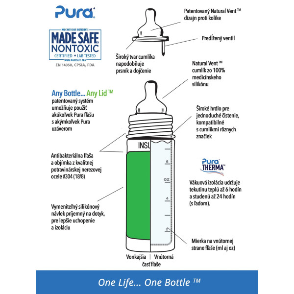 Konečne bezpečná fľaša vyrobená 100% bez plastových častí. S Pura fľašami si môžete byť istí, že sa do nápoja vnútri neuvoľňujú žiadne škodlivé látky a toxíny, ani príchute a pachy ako je tomu u plastových fliaš alebo fliaš s plastovými vrchnákmi. Na ničom nezáleží viac ako na zdraví Vašich detí a Vás.Kvalitná vákuová termoizolácia udrží tekutinu teplú až 6 hodín a studenú až 24 hodín (s ľadom).Pura fľaše sa navyše prispôsobujú a “rastú” s Vašim dieťaťom. Jednoduchou výmenou uzáverov sa fľaša mení z dojčenskej fľaše na fľašu s náustkom, slamkou alebo športovým uzáverom či na pohárik na príkrmy a občerstvenie. Môžete tak jednu fľašu používať mnoho rokov. One Life… One Bottle™.Najbezpečnejšia, najuniverzálnejšia, ľahká a nerozbitná ekologická fľaša ocenená viac ako 35 oceneniami. Prvá fľaša na trhu 100% bez plastových častí a jediná fľaša, ktorá získala certifikát Made Safe® . Vákuová termoizolácia udrží tekutinu teplú až 6 hodín a studenú až 24 hodín (s ľadom). Baby Grows… Bottle Evolves™ - patentovaný systém umožňuje použiť akúkoľvek Pura fľašu s akýmkoľvek Pura uzáverom. Jednoducho tak zmeníte dojčenskú fľašu na fľašu s náustkom, slamkou, alebo športovým uzáverom alebo s použitím tesniaceho disku na pohárik na príkrmy a drobné občerstvenie. Jednu fľašu tak môžete používať roky a zároveň šetríte peniaze aj životné prostredie. Fľaša a objímka sú vyrobené z prvotriednej potravinárskej nerezovej ocele triedy 304 (18/8) a ostatné časti zo silikónu najvyššej medicínskej kvality. Bez BPA, PVC, ftalátov a bez akýchkoľvek iných nebezpečných látok a toxínov, testované podľa smerníc EÚ. Antikolikový cumlík Pura Natural Vent Nipple so stredným prietokom vyrobený zo silikónu medicínskej kvality. Fľaša je kompatibilná s cumlíkmi mnohých iných značiek. Mierka na vnútornej strane pre pohodlné a presné dávkovanie. Súčasťou je silikónový vrchnák chrániaci cumlík a vymeniteľný farebný silikónový návlek na fľašu pre lepšie uchopenie a izoláciu. Nevhodné do umývačky riadu. Pre zachovanie termo-izolačných vlastností odporúčame fľašu umývať ručne. Nesterilizovať. Doživotná zaruka na časti z nerezovej ocele. Nevzťahuje sa na mechanické poškodenie fľaše. Váha: 182gRozmery: 5,9 x 19,6cmBalenie obsahuje: nerezovú fľašu s vákuovou termoizoláciou 260ml, nerezovú objímku, antikolikový cumlík Pura Natural Vent Nipple (stredný prietok), silikónový návlek a vrchnák