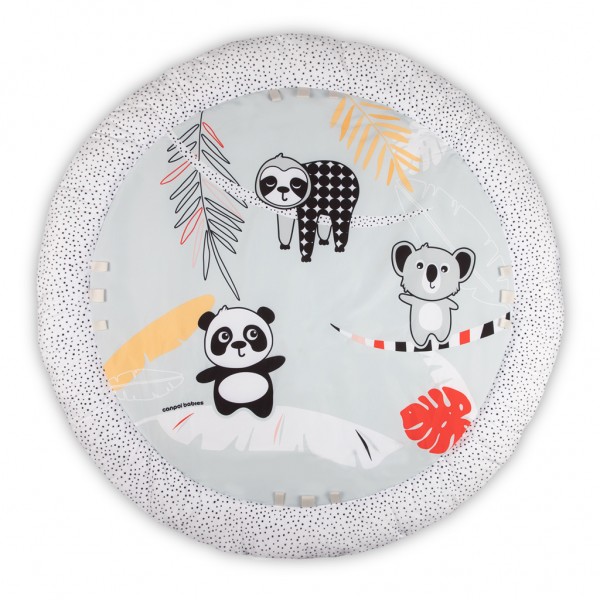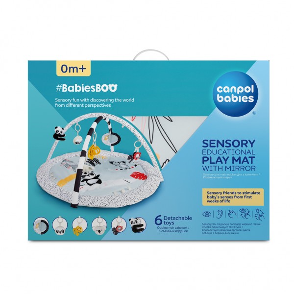 Senzorická edukačná podložka na hranie Canpol babies umožňuje vášmu dieťaťu objavovať svet z rôznych uhlov pohľadu. Rôzne textúry materiálov, kontrastné farby a jemné zvuky sú skvelou zábavou pre rozvíjajúce sa zmysly bábätka od prvých chvíľ života. Edukačná podložka so 6 hračkami, ktoré podnecujú dieťa k aktivite a siahajú po nich, pomáha rozvíjať motoriku, posilňuje svalstvo a precvičuje manuálne zručnosti. Hračky sú zavesené na oblúkoch, ktoré sa dajú ľahko odstrániť, aby ste mohli podložku umyť alebo vziať so sebou, kamkoľvek chcete, aby ste vytvorili priestor pre dieťa a zabezpečili tak bezpečný a čistý prietor na cestách. Hračky sa dajú odopnúť a dať na hranie: 2 hrkajúce tváričky zvieratiek, 2 šuštiace listy so zrkadielkom obklopeným farebnými štítkami a hrkálkou, hryzátko, ktoré prinesie úľavu pri prerezávaní zúbkov, veľké odnímateľné zrkadlo, ktoré možno pripevniť kdekoľvek a keď bábätko vyrastie, povzbudí k ležaniu na brušku a panda s pískadlom a labkami na suchý zips, vďaka čomu ich môžete spojiť a omotať okolo čelenky podložky alebo priečky detskej postieľky. Všetky tieto interaktívne prvky podporujú rodiča v zmyslovom tréningu dieťaťa, čo priaznivo ovplyvňuje emocionálny a kognitívny vývoj bábätka. Senzorická edukačná podložka Canpol babies povzbudzuje dieťa k gymnastike a chyteniu závesných hračiek, pričom prostredníctvom hry podporuje rozvoj zmyslov – zraku, sluchu a hmatu, ako aj manuálnych a motorických zručností. Ležanie na edukačnej podložke umožňuje dieťaťu vidieť určité zákonitosti, napr. že mávnutím ruky a dotykom visiacich hračiek spôsobí ich pohyb a hojdanie. Počas ležania na brušku môže dieťatko zakaždým skúmať rôzne časti podložky, ktoré zaujmú jasnými kontrastnými farbami a vzormi, visačkami alebo hračkami, ktoré sú presunuté na iné miesto ako zvyčajne. V neskoršom štádiu vývoja bude senzorická edukačná podložka povzbudzovať dieťa, aby sa hýbalo – najprv sa plazilo. Senzorická edukačná podložka Canpol babies pomôže zabezpečiť správnu motoriku každého bábätka! Senzorická edukačná podložka Canpol babies predstavuje bezpečný a skvelý spôsob, ako zabaviť dieťa a umožní rodičom chvíľku pre seba alebo pre domáce práce.