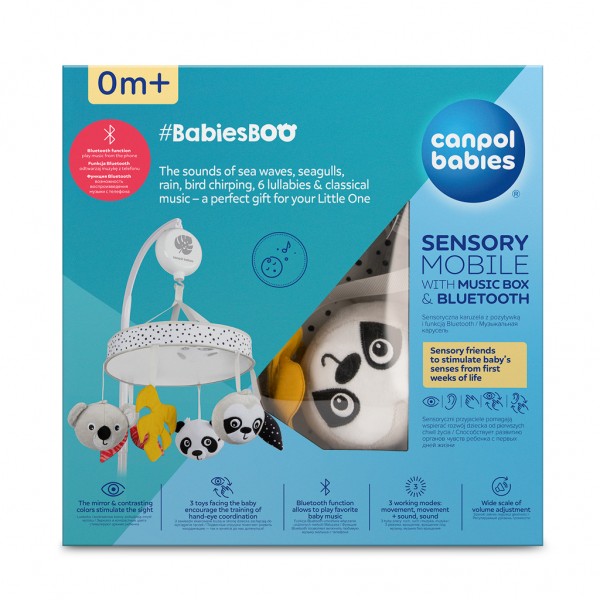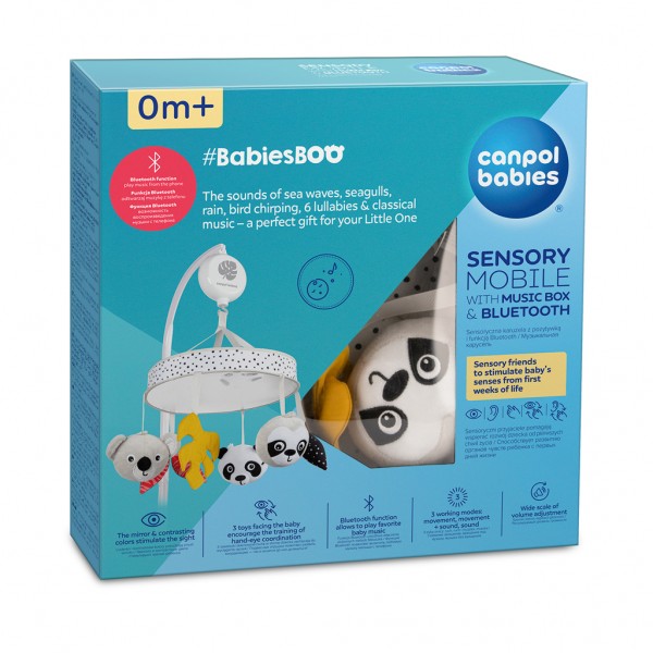 Jedinečný a moderný senzorický kolotoč do postieľky zaujme dieťatko počas dňa a vytvorí útulnú a pokojnú atmosféru na spanie. Kolotoč hrá 60 minút neprerušovanej melódie a po uplynutí tejto doby sa automaticky vypne – 11 melódií: biely šum, zvuky morských vĺn a lietajúcich čajok, dážď, lesný hluk a spev vtákov, 6 uspávaniek a klasická Mozartova hudba. Zariadenie s funkciou Bluetooth vám umožní zapnúť obľúbené melódie a rozprávky z aplikácie vo vašom mobilnom telefóne. Kolotoč má 3 prevádzkové režimy: pohyb, pohyb a hudba alebo len hudba a široký rozsah nastavenia hlasitosti – jednoducho ho prispôsobíte preferenciám vášho dieťatka. Canpol babies senzorický plyšový kolotoč má špeciálne profilovanú čelenku, vďaka ktorej sa dá ľahko a stabilne pripevniť na rám detskej postieľky. Na kolotoči je 6 rôznych hračiek, z ktorých 3 milé zvieratká pozerajú na bábätko. Kontrastné farby – biela a čierna v kombinácii so žltou a červenou farbou upútajú pozornosť dieťaťa a podnecujú fantáziu. Na celej ploche spodného priemeru je zrkadlo, v ktorom dieťa vidí svoju tvár, vzbudzuje jeho zvedavosť a záujem. Prívesky namontované na kolotoči a veľké zrkadlo povzbudzujú dieťa, aby k nim natiahlo ručičky, čo podporuje rozvoj jeho svalov a zapája zrak a trénuje koordináciu oko-ruka. Senzorický kolotoč Canpol babies s hracou skrinkou a Bluetooth BabiesBoo je perfektným nápadom na darček pre novorodenca alebo pre bábätko.