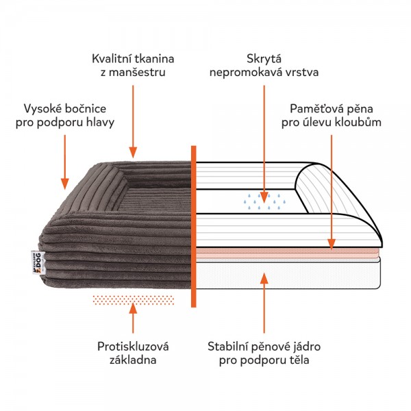 Skutočný odpočinok pre malé a stredne veľké psyCloud S je ortopedický pelech pre psov navrhnutý tak, aby poskytoval stabilnú oporu, úľavu kĺbom a maximálne pohodlie – každý deň. Dvojvrstvá matrac, kvalitné materiály a funkčná konštrukcia robia z Cloudu ideálne miesto na spánok aj regeneráciu. Psy spia 12 až 18 hodín denne a ich spánok je zvyčajne ľahký a často prerušovaný. Keď má pes svoje pohodlné a pokojné miesto, môže si skutočne oddýchnuť. Ortopedický pelech mu poskytuje nielen oporu pre telo, ale aj istotu a pohodu, ktorú potrebuje každý deň.Jadro pelechu tvorí 5 cm vysoká polyuretánová pena (PUR) o hustote 25D, ktorá slúži ako pevná a odolná základňa. Na nej leží 2 cm pamäťovej peny o hustote 40D, ktorá sa prispôsobí tvaru tela psa, rovnomerne rozloží tlak a uľaví kĺbom aj chrbtici. Celková výška matrace je 7 cm, čo zabezpečuje pohodlie bez prehnaného prepadania a zároveň uľahčuje pohyb v pelíšku.Bočnice vysoké 15 cm tvoria prirodzenú oporu hlavy a zároveň pomáhajú vytvoriť chránený a útulný priestor. Pes sa tak môže ľahko uvoľniť a nerušene odpočívať, bez stresu a vyrušovania.Použité materiály spĺňajú najprísnejšie normy kvality a bezpečnosti. Poťah z jemného manšestru má certifikát OEKO-TEX Standard 100, ktorý zaručuje, že neobsahuje žiadne škodlivé látky. Manšestr je vyrobený zo 100 % polyesteru, na rozdiel od bavlny ľahko neabsorbuje vodu, rýchlejšie schne a je odolnejší voči zápachu. Samotná ortopedická matrac je vyrobená z pěn certifikovaných podle CertiPUR-US, tedy bez formaldehydu a těžkých kovů.Vďaka odolným zipsom YKK sa poťah dá ľahko zložiť a vyprať v práčke, čo zaručuje nielen hygienu, ale aj dlhú životnosť celého pelechu.Rozmery:- Vonkajšie: 80 x 60 cm- Vnútorný priestor: 56 x 36 cm- Výška bočnic: 15 cm- Výška matrace: 7 cm (5 cm PUR + 2 cm pamäťová pena)Vodoodolná vnútorná vrstva chráni penové jadro pred vlhkosťou, znečistením alebo drobnými nehodami. Vďaka nej zostáva vnútro pelechu suché a čisté, aj keď pes príde z dažďa alebo má mokré labky.Protiskluzová spodná časť zaisťuje stabilitu pelechu na všetkých typoch podláh – neklouže po dlažbe ani plávajúcej podlahe, čo oceníte najmä pri starších psoch alebo pri divokejších pohyboch.Údržba: Poťah je odnímateľný a možno ho prať v práčke na 30 °C. Nepremokavú vrstvu možno jednoducho utrieť vlhkou handričkou alebo samostatne opraťTento pelech je navrhnutý tak, aby slúžil vášmu psovi dlhé roky. Vďaka starostlivo vybraným materiálom, kvalitnému spracovaniu a premyslenej konštrukcii si zachováva svoj tvar, odoláva každodennému používaniu a poskytuje stále rovnakú mieru pohodlia a opory.Odpočívajte v pokoji, kráčajte s hrdosťou.Adresa dodávateľa: onborn, s.r.o., Drahobejlova 2515/18, 190 00 Praha, info@onborn.cz