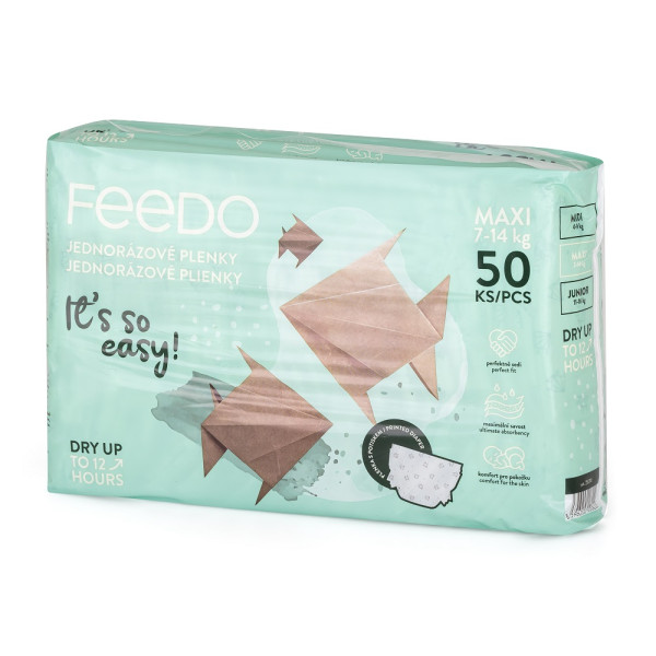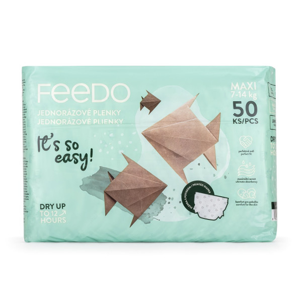 It’s so easy!Jedinečné jednorazové plienky pre deti - pohodlie, savosť a bezpečnosť v jednom.Jednorazové plienky pre deti z pestrofarebnej kolekcie FEEDO! Boli navrhnuté špeciálne s ohľadom na rodičov a ich najmenších a vďaka dokonale premysleným vlastnostiam poskytujú komfort pri používaní, vynikajúcu ochranu a pokoj počas celého dňa. Chránia pred pretečením až 12 hodín, zaisťujú maximálnu savosť a flexibilne sa prispôsobujú dieťatku. Zabudnite na výmenu plienok v nociVďaka superabsorbčným a trom ochranným vrstvám udržia naše detské plienky pokožku vášho dieťaťa dlho v suchu a pohodlí. Bez ohľadu na to, či ide o ochranu počas každodennej aktivity dieťaťa alebo počas jeho nočného odpočinku, plienky FEEDO nikdy nesklamú.Priedušné materiály pre zdravú pokožkuDeti potrebujú vzdušné a bezpečné plienky, ktoré umožňujú pokožke dýchať a zároveň ju chránia pred vlhkosťou. Plienky FEEDO obsahujú tieto dôležité prvky, ktoré vytvárajú cirkuláciu vzduchu.Flexibilné prispôsobenie sa dieťatkuVďaka špeciálne navrhnutým páskam na opakované použitie sa plienky dokonale prispôsobia tvaru každého dieťaťa bez toho, aby obmedzovali jeho pohyb. Znamená to väčšie pohodlie a predchádza nechcenému presakovaniu a nepríjemnému podráždeniu pokožky.Okamžitý pocit suchaUž sa nemusíte obávať nepríjemností spôsobených dotykom mokrej plienky. Naše jednorazové plienky poskytujú okamžité sucho tým, že absorbujú vlhkosť v priebehu niekoľkých sekúnd, čo znamená, že vaše dieťa môže zostať dlho pohodlne v suchu.Jemné a bezpečné pre detskú pokožkuPlienky FEEDO neobsahujú žiadne škodlivé zložky. Sú jemné na dotyk a navrhnuté tak, aby boli bezpečné aj pre tú najcitlivejšiu detskú pokožku. detskú pokožku. Potvrdzujú to dermatologické testy jednotlivých zložiek.Jednorazové detské plienky FEEDO sú voľbou, na ktorú sa môžete spoľahnúť. Poskytujú maximálny komfort používania, neobsahujú parfumy ani latex, čím minimalizujú riziko vzniku alergií. Vďaka nim bude každý deň strávený s vaším dieťatkom ešte výnimočnejší. S plienkami FEEDO je všetko také jednoduché!- Dermatologicky testované - áno- Doba ochrany - 12 hodín- Cieľová skupina - chlapec, dievča- Minimálna hmotnosť dieťaťa - 7 kg - Maximálna hmotnosť dieťaťa - 14 kg - Priedušný materiál - Áno- Veľkosť - Maxi - 4 - Pôvod - CZ- Množstvo v balení - 50 ks- Typ balenia - plastové vrecko- Šírka balenia – 32 cm- Dĺžka balenia – 10,5 cm- Výška balenia – 22 cm- Dĺžka x šírka plienky: 490 x 215 mm- Dĺžka x šírka absorpčného jadra: 360 x (120/90) mm- Hmotnosť plienky: 27,8 g- Hmotnosť balenia: 1456 gPríbeh o Origami plienkeV jednom japonskom mestečku žila stará pani Yumi. Bola známa svojimi zručnosťami v origami, umením skladania papiera. Medzi jej obľúbené tvory patrila jednoduchá origami ryba, ktorú dokázala poskladať za pár sekúnd.Jedného dňa prišla k Yumi mladá mamička s malým bábätkom. Pozerala, ako stará pani rýchlo a šikovne skladá rybičku a povedala: "Vaše ruky pracujú tak rýchlo a zručne! Mne by sa hodili také ruky, keď mením plienku môjmu bábätku."Pani Yumi sa usmiala a povedala: "Vieš, skladanie origami ryby je tak jednoduché, ako vymeniť plienku. Potrebuješ len správnu techniku a trochu praxe." Potom vzala novú plienku a ukázala mamičke, ako rýchlo a ľahko môže svoje bábätko prebaliť.Mamička bola prekvapená a povedala: "Aha! Keď sa na to takto pozriem, skutočne to vyzerá jednoducho. Vaša origami rybička mi pripomína, že s trochou praxe môže byť aj zložitá úloha jednoduchá."Stará pani Yumi sa zasmiala a odpovedala: "Presne tak. Ako v origami, aj v živote je dôležité nájsť správny spôsob, ako sa veci majú robiť."Adresa dodávateľa: ags 92, s.r.o., Drahobejlova 2515/18, 190 00 Praha email: feedo@feedo.cz