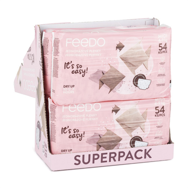 Mesačná zásoba 4 ks balení plienok vo veľkosti MIDI.It’s so easy!Jedinečné jednorazové plienky pre deti - pohodlie, savosť a bezpečnosť v jednom.Jednorazové plienky pre deti z pestrofarebnej kolekcie FEEDO! Boli navrhnuté špeciálne s ohľadom na rodičov a ich najmenších a vďaka dokonale premysleným vlastnostiam poskytujú komfort pri používaní, vynikajúcu ochranu a pokoj počas celého dňa. Chránia pred pretečením až 12 hodín, zaisťujú maximálnu savosť a flexibilne sa prispôsobujú dieťatku. Zabudnite na výmenu plienok v nociVďaka superabsorbčným a trom ochranným vrstvám udržia naše detské plienky pokožku vášho dieťaťa dlho v suchu a pohodlí. Bez ohľadu na to, či ide o ochranu počas každodennej aktivity dieťaťa alebo počas jeho nočného odpočinku, plienky FEEDO nikdy nesklamú.Priedušné materiály pre zdravú pokožkuDeti potrebujú vzdušné a bezpečné plienky, ktoré umožňujú pokožke dýchať a zároveň ju chránia pred vlhkosťou. Plienky FEEDO obsahujú tieto dôležité prvky, ktoré vytvárajú cirkuláciu vzduchu.Flexibilné prispôsobenie sa dieťatkuVďaka špeciálne navrhnutým páskam na opakované použitie sa plienky dokonale prispôsobia tvaru každého dieťaťa bez toho, aby obmedzovali jeho pohyb. Znamená to väčšie pohodlie a predchádza nechcenému presakovaniu a nepríjemnému podráždeniu pokožky.Okamžitý pocit suchaUž sa nemusíte obávať nepríjemností spôsobených dotykom mokrej plienky. Naše jednorazové plienky poskytujú okamžité sucho tým, že absorbujú vlhkosť v priebehu niekoľkých sekúnd, čo znamená, že vaše dieťa môže zostať dlho pohodlne v suchu.Jemné a bezpečné pre detskú pokožkuPlienky FEEDO neobsahujú žiadne škodlivé zložky. Sú jemné na dotyk a navrhnuté tak, aby boli bezpečné aj pre tú najcitlivejšiu detskú pokožku. detskú pokožku. Potvrdzujú to dermatologické testy jednotlivých zložiek.Jednorazové detské plienky FEEDO sú voľbou, na ktorú sa môžete spoľahnúť. Poskytujú maximálny komfort používania, neobsahujú parfumy ani latex, čím minimalizujú riziko vzniku alergií. Vďaka nim bude každý deň strávený s vaším dieťatkom ešte výnimočnejší. S plienkami FEEDO je všetko také jednoduché!Dermatologicky testované - ánoDoba ochrany - 12 hodínCieľová skupina - chlapec, dievčaMinimálna hmotnosť dieťaťa - 4 kg Maximálna hmotnosť dieťaťa - 9 kg Priedušný materiál - ÁnoVeľkosť - Midi - 3 Pôvod - CZMnožstvo v balení - 4 x 54 ksHmotnosť plienky: 21 gPríbeh o Origami plienkeV jednom japonskom mestečku žila stará pani Yumi. Bola známa svojimi zručnosťami v origami, umením skladania papiera. Medzi jej obľúbené tvory patrila jednoduchá origami ryba, ktorú dokázala poskladať za pár sekúnd.Jedného dňa prišla k Yumi mladá mamička s malým bábätkom. Pozerala, ako stará pani rýchlo a šikovne skladá rybičku a povedala: "Vaše ruky pracujú tak rýchlo a zručne! Mne by sa hodili také ruky, keď mením plienku môjmu bábätku."Pani Yumi sa usmiala a povedala: "Vieš, skladanie origami ryby je tak jednoduché, ako vymeniť plienku. Potrebuješ len správnu techniku a trochu praxe." Potom vzala novú plienku a ukázala mamičke, ako rýchlo a ľahko môže svoje bábätko prebaliť.Mamička bola prekvapená a povedala: "Aha! Keď sa na to takto pozriem, skutočne to vyzerá jednoducho. Vaša origami rybička mi pripomína, že s trochou praxe môže byť aj zložitá úloha jednoduchá."Stará pani Yumi sa zasmiala a odpovedala: "Presne tak. Ako v origami, aj v živote je dôležité nájsť správny spôsob, ako sa veci majú robiť."Adresa dodávateľa: ags 92, s.r.o., Drahobejlova 2515/18, 190 00 Praha email: feedo@feedo.cz