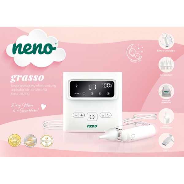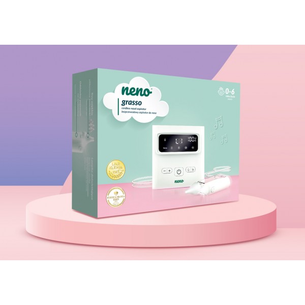 Neno Grasso je bezkáblový elektronický nosový odsávač hlienov pre deti od narodenia až do 6 rokov. Profesionálny pomocník pre jednoduché a účinné uvoľnenie dýchania vášho dieťaťa. Šetrne a efektívne odstraňuje hlieny rôznej hustoty, uľahčuje dýchanie a zlepšuje pohodu detí počas nádchy aj v bežných situáciách.Vlastnosti:- Funkcia Active Airflow – dynamické prúdenie vzduchu zaručuje účinné, ale jemné odsávanie bez podráždenia sliznice- Až 9 úrovní sacieho výkonu – prispôsobenie intenzity podľa hustoty hlienu, od jemného čistenia až po silnejšie odsávanie- Dve možnosti odsávania – priamy kontakt alebo odsávanie z krátkej vzdialenosti pre dôkladné vyčistenie horných dýchacích ciest- Tri ergonomické silikónové nástavce – mäkké, bezpečné a tvarované podľa vývoja detského nosa- Upokojujúce zvuky – dve melódie a biely šum pre vytvorenie pokojnej atmosféry počas odsávania- Bezdrôtová prevádzka – používanie bez káblov pre úplnú slobodu pohybu doma aj vonku- Rýchle a praktické USB-C nabíjanie – ideálne pre rodičov na cestách- Jednoduchá hygiena – samostatná nádoba na hlien a ľahko čistiteľné diely- Praktický úložný priestor – zásuvka na príslušenstvo, ktorá pomáha udržať všetko na jednom mieste- LED osvetlenie – lepšia viditeľnosť pri odsávaní v slabom svetle- Ľahký a kompaktný – pohodlný na prenášanie v taške alebo batohu- Dlhodobé použitie – spoľahlivý od narodenia až do 6 rokovObsah balenia:- Elektronický nosový odsávač Neno Grasso- 3 silikónové nástavce- Nádoba na hlien s LED osvetlením- 2 hadičky (50 cm a 100 cm)- 5 filtrov- Kefka a plochá kefka na čistenie- Pinzeta- USB-C nabíjací kábel- Ochranné puzdro- Návod na použitieTechnické parametre:- Napájanie: 5 V / 1 A- Batéria: Li-Pol 3,7 V / 1500 mAh- Sací výkon: max. 60 kPa ±5 kPa- Prúdenie vzduchu: 7 l/min- Objem nádoby: 35 ml- Materiál nástavcov: silikón- Hlučnosť: ≤ 65 dB- Hmotnosť: 375 gRozmery balenia: 11,4 × 11,4 × 5 cmDôležité: Pred prvým použitím si pozorne prečítajte návod na použitie. Po každom použití komponenty vyčistite a pravidelne sterilizujte. Adresa výrobcu: KGK Trend sp. z o.o., ul. Ujastek 5b, 31–752 Kraków, Poľsko. info@kgktrend.pl, NIP 678 315 51 46