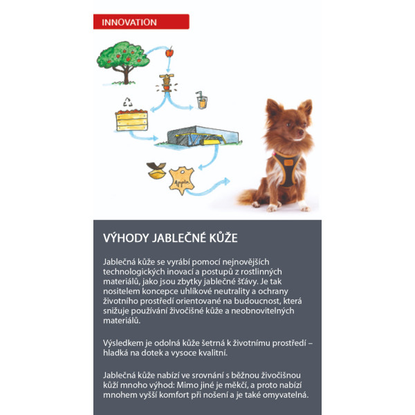 Dokonalá kombinácia elegantného koženého vzhľadu s najvyššou kvalitou: Prvý vegánsky postroj pre psov na svete vyrobený z jablčnej kože.Pomocou najnovších technologických inovácií a postupov sa jablčná koža vyrába z rastlinných materiálov, ako sú zvyšky jablčnej šťavy. Týmto spôsobom v sebe nesie koncepciu orientovanú na budúcnosť, ktorá spočíva v uhlíkovej neutralite a ochrane životného prostredia, čím sa znižuje používanie živočíšnej kože a neobnoviteľných materiálov.Výsledkom je odolná koža šetrná k životnému prostrediu – hladká na dotyk a vysokokvalitná.Jablčná koža ponúka v porovnaní s bežnou kožou zo zvierat mnohé výhody: Okrem iného je mäkšia, a preto poskytuje oveľa vyšší komfort pri nosení a je tiež ľahko umývateľná.Rovnako ako všetky postroje Curli je aj tento postroj veľmi ľahký a veľmi mäkký. Vysoko inovatívna rastlinná hybridná koža je ešte mäkšia ako bežná zvieracia koža.Vďaka perforácii jablčnej kože je priepustná pre vzduch.Spolu s optimalizovaným strihom poskytuje maximálnu voľnosť pohybu a zaručuje maximálne pohodlie pri nosení.Vlastnosti: - Priedušný pohodlný materiál. - Jednoduché obliekanie i vyzliekanie postroja. - Vylepšená ergonómia postroja. - Najjednoduchšie a najbezpečnejšie zapínanie postroja pomocou ultraľahkej spony – jednoduché zapnutie jednou rukou. - Vysoko inovatívna hybridná rastlinná koža vyrobená z vedľajších produktov výroby jablčnej šťavy - Mimoriadne mäkký postroj - Ľahký – pre maximálne pohodlie a voľnosť pohybu - Postroj je umývateľný s vysokou odolnosťou proti oderu - Šetrný k životnému prostrediu vďaka najmodernejšej recyklácií 2 stupňa - Výrazne zlepšená ergonómia a optimalizované prispôsobenie vďaka novému 3D vzoru Comfort fit - Dokonalé rozloženie napätia vďaka pásom všitých do švov postroja - Možnosť nastavenia veľkosti pomocou suchého zipsu na prispôsobenie tvaru tela- DogFinder ID – ktorý vám pomôže nájsť vášho psa v prípade, ak sa vám stratí. Materiál: - Jablčná koža, PU, Nylon - Suchý zips – Nylon - Pásy – Nylon - Spona – POM zliatina Čistite vlhkou handričkou. Používajte iba jemné čistiace prostriedky. Nikdy nepoužívajte bielidlo alebo alkohol!Uchovávejte mimo dosah dětí.Adresa dodávateľa: curli AG, Sonnhaldenstrasse 63c, 6331 Hünenberg, Switzerlandproduct@mycurli.com