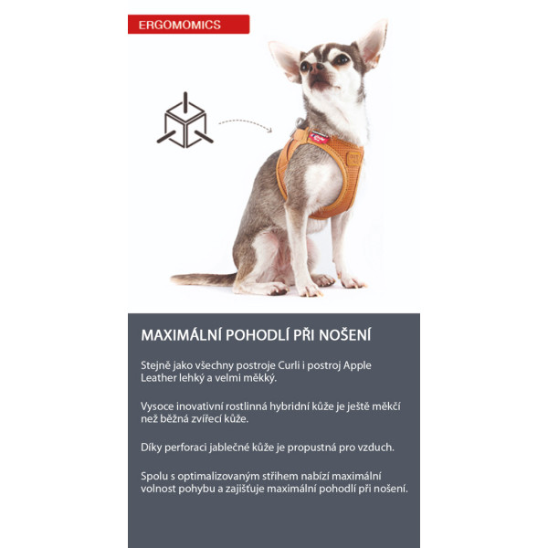 Dokonalá kombinácia elegantného koženého vzhľadu s najvyššou kvalitou: Prvý vegánsky postroj pre psov na svete vyrobený z jablčnej kože.Pomocou najnovších technologických inovácií a postupov sa jablčná koža vyrába z rastlinných materiálov, ako sú zvyšky jablčnej šťavy. Týmto spôsobom v sebe nesie koncepciu orientovanú na budúcnosť, ktorá spočíva v uhlíkovej neutralite a ochrane životného prostredia, čím sa znižuje používanie živočíšnej kože a neobnoviteľných materiálov.Výsledkom je odolná koža šetrná k životnému prostrediu – hladká na dotyk a vysokokvalitná.Jablčná koža ponúka v porovnaní s bežnou kožou zo zvierat mnohé výhody: Okrem iného je mäkšia, a preto poskytuje oveľa vyšší komfort pri nosení a je tiež ľahko umývateľná.Rovnako ako všetky postroje Curli je aj tento postroj veľmi ľahký a veľmi mäkký. Vysoko inovatívna rastlinná hybridná koža je ešte mäkšia ako bežná zvieracia koža.Vďaka perforácii jablčnej kože je priepustná pre vzduch.Spolu s optimalizovaným strihom poskytuje maximálnu voľnosť pohybu a zaručuje maximálne pohodlie pri nosení.Vlastnosti: - Priedušný pohodlný materiál. - Jednoduché obliekanie i vyzliekanie postroja. - Vylepšená ergonómia postroja. - Najjednoduchšie a najbezpečnejšie zapínanie postroja pomocou ultraľahkej spony – jednoduché zapnutie jednou rukou. - Vysoko inovatívna hybridná rastlinná koža vyrobená z vedľajších produktov výroby jablčnej šťavy - Mimoriadne mäkký postroj - Ľahký – pre maximálne pohodlie a voľnosť pohybu - Postroj je umývateľný s vysokou odolnosťou proti oderu - Šetrný k životnému prostrediu vďaka najmodernejšej recyklácií 2 stupňa - Výrazne zlepšená ergonómia a optimalizované prispôsobenie vďaka novému 3D vzoru Comfort fit - Dokonalé rozloženie napätia vďaka pásom všitých do švov postroja - Možnosť nastavenia veľkosti pomocou suchého zipsu na prispôsobenie tvaru tela- DogFinder ID – ktorý vám pomôže nájsť vášho psa v prípade, ak sa vám stratí. Materiál: - Jablčná koža, PU, Nylon - Suchý zips – Nylon - Pásy – Nylon - Spona – POM zliatina Čistite vlhkou handričkou. Používajte iba jemné čistiace prostriedky. Nikdy nepoužívajte bielidlo alebo alkohol!Uchovávejte mimo dosah dětí.Adresa dodávateľa: curli AG, Sonnhaldenstrasse 63c, 6331 Hünenberg, Switzerlandproduct@mycurli.com