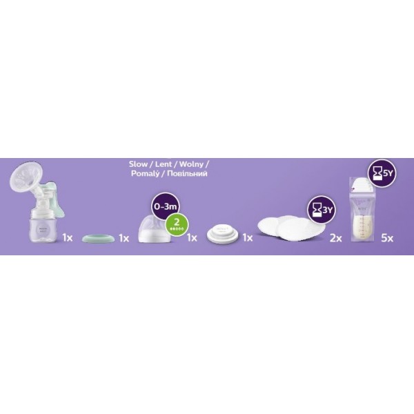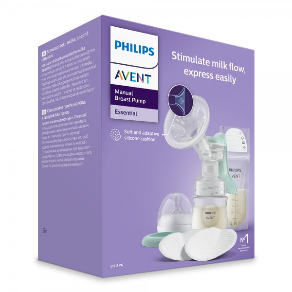 Stimulujte tok mlieka a odsávajte bez námahy. Pre jemné a pohodlné odsávanie.Manuálna odsávačka mlieka Philips Avent Essential je navrhnutá tak, aby stimulovala tok mlieka a umožnila vám ho odsať čo najviac. Pomáha vytvoriť zásobu materského mlieka, aby ste mohli starostlivosť o dieťatko prenechať aj niekomu inému a dopriať si chvíle odpočinku.Jednoduché čistenieJednoduché čistenie a zloženie (kryt proti prachu)Jemné a pohodlnéMäkká prispôsobivá silikónová vložka na jemnú stimuláciuPohodlné odsávanieErgonomický dizajn rukoväti pre jednoduché odsávaniePrenosné a praktickéĽahký a kompaktný dizajnBez BPAUPOZORNENIE!- Odsávačku materského mlieka nikdy nepoužívajte počas tehotenstva, pretože odsávanie môže vyvolať pôrod.- Nedovoľte, aby sa so súčasťami odsávačky mlieka, baliacimi materiálmi či ostatným príslušenstvom hrali deti alebo zvieratá.- Pred každým použitím skontrolujte, či odsávačka mlieka nevykazuje známky poškodenia. Ak je odsávačka mlieka poškodená alebo nefunguje správne, nepoužívajte ju.Varovania na zabránenie kontaminácii a zaistenie riadnej hygieny:- Z hygienických dôvodov je odsávačka určená len na opakované používanie jednou osobou.- Všetky súčasti očistite a vydezinfikujte pred prvým použitím a po každom ďalšom použití.- Na čistenie súčastí odsávačky mlieka nepoužívajte antibakteriálne čistiace prostriedky ani tekutý piesok, pretože by ste ich mohli poškodiť.- Skôr než sa dotknete súčastí odsávačky a prsníkov, dôkladne si umyte ruky mydlom a vodou, aby ste zabránili kontaminácii. Nedotýkajte sa vnútornej strany nádobiek ani viečok.Varovania na zabránenie problémom vrátane bolestivosti prsníkov a bradaviek:- Pred zložením tela odsávačky z prsníka vždy najprv uvoľnite rukoväť, aby ste uvoľnili podtlak.- Ak je podtlak nepríjemný alebo vám spôsobuje bolesť, prestaňte odsávať a zložte si odsávačku mlieka z prsníka.- Ak sa vám nepodarí odsať žiadne mlieko do piatich minút, nepokračujte v odsávaní. Skúste odsávať v priebehu inej časti dňa.- Ak odsávanie začne byť veľmi nepríjemné alebo bolestivé, prestaňte používať odsávačku a poraďte sa so svojím odborníkom z oblasti starostlivosti o zdravie.- Používajte len príslušenstvo a súčasti odporúčané spoločnosťou Philips Avent.- Úpravy odsávačky mlieka nie sú dovolené.Varovanie: Ak ste nakazená vírusom ľudskej imunitnej nedostatočnosti (HIV) alebo hepatitídou typu B alebo C, používanie odsávačky mlieka nezníži ani neodstráni riziko prenosu vírusu na vaše dieťa prostredníctvom materskéhomlieka.Výstraha- Jednotlivé súčasti uchovávajte mimo vyhriatych povrchov, aby sa nezdeformovalAdresa výrobcu:Philips Consumer Lifestyle B.V., Tussendiepen 4, 9206 AD Drachten, The Netherlands, PH.CentralRegulatoryOfficer@philips.com