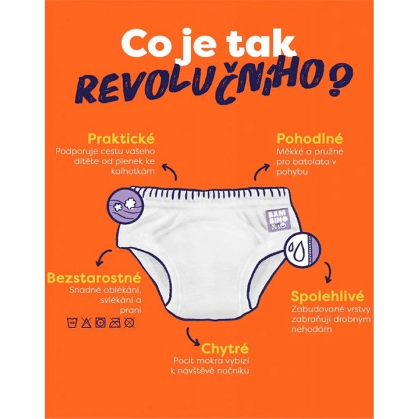 Nepriepustná vrstva spolu s absorpčnou vrstvou čiastočne chráni pred znečistením okolia. Pomáhajú zrýchliť proces učenia sa na nočník, avšak nenahradzujú plienky. Môžete ich dať dieťaťu ako darček. Dodajú dieťaťu pocit, že už vyrástlo a plienky nepotrebuje. Nepoužívajte ich skôr ako je dieťa na prechod na nočník pripravené. Učiace plienkové nohavičky síce obsahujú absopčnú vrstvu, ktorá zachytí menšie množstvo moču, ale nenahradzujú plnohodnotne viacvrstvovú plienku s nohavičkami. Sú určené pre dieťa, ktoré už prechádza na nočník a občas sa mu prihodí nepríjemná príhoda. V učiacich plienkových nohavičkách vlhkosť ihneď ucíti, môže si ju uvedomiť a posadiť sa na nočník. Učiace plienkové nohavičky nedávajte dieťaťu na noc či na spanie a pokiaľ nemáte inú možnosť vložte do nich ešte ďalšiu viacvrstvovú plienku Bambino Mio, ktorá doplní absorpčnú kapacitu. Pred prvým použitím učiace plienkové nohavičky minimálne dvakrát predperte.- Ohľaduplné k planéte – tieto pokrokové nohavice sú prvými krokmi vašich maličkých k čistejšej planéte!- Praktické - Podporujú prechod vášho dieťaťa od plienok k spodnej bielizni- Spoľahlivé – vnútorné absorpčné vrstvy zabraňujú malým nehodám.Pranie: v práčke pri 40°C, môže sa sušiť v sušičke pri nízkej teplote, nežehliť. Zloženie: 80% bavlna, 20% polyester, laminované polyuretánom.Varovanie: nenechávajte deti bez dozoru.Adresa dodávateľa: Bambinomio LTD, www.bambinomio.com