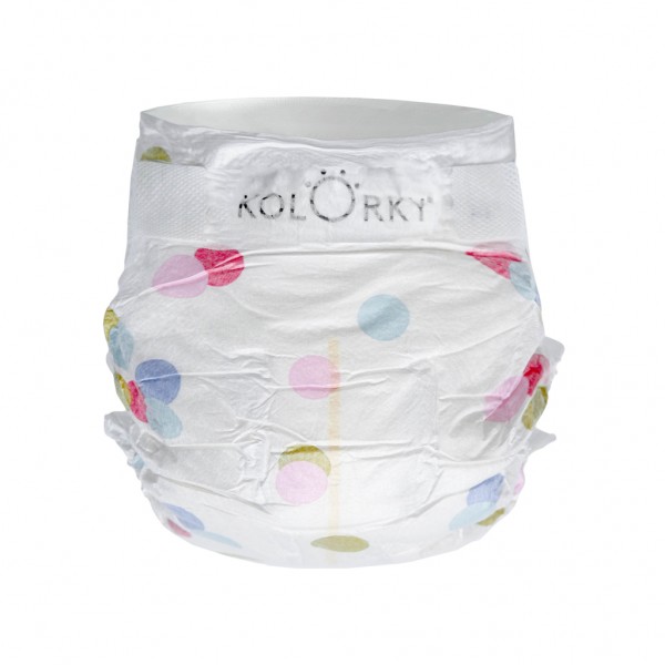 KOLORKY DAY MOMENTS sú veľmi tenké a sú určené pre každý moment s vašimi najmenšími. Vďaka svojmu strihu neobmedzujú bábätko v pohybe. Sú vyrobené z prírodných a obnoviteľných materiálov, neobsahujú parfémy, ftaláty ani iné škodlivé látky. Technológia Flash dry zaručuje, že tekutina je rýchlo odvedená od pokožky bábätka a pevne uzamyká v jadre nielen tekutiny, ale aj zápach. Absorpčné kanáliky navyše zaisťujú, že sa tekutina rovnomerne rozprestrie po celom savom jadre a nehromadí sa na jednom mieste. Plienky majú tiež indikátor vlhkosti, ktorý vám napovie, že je bábätko potrebné prebaliť. Dizajn je plný farebných konfiet a nesie názov Celebration, pretože každý moment s vašim dieťaťom si zaslúži osláviť.Zloženie: buničina, netkaná textília, PP/PES, LDPE, SAP gél, lepidlo, elastan