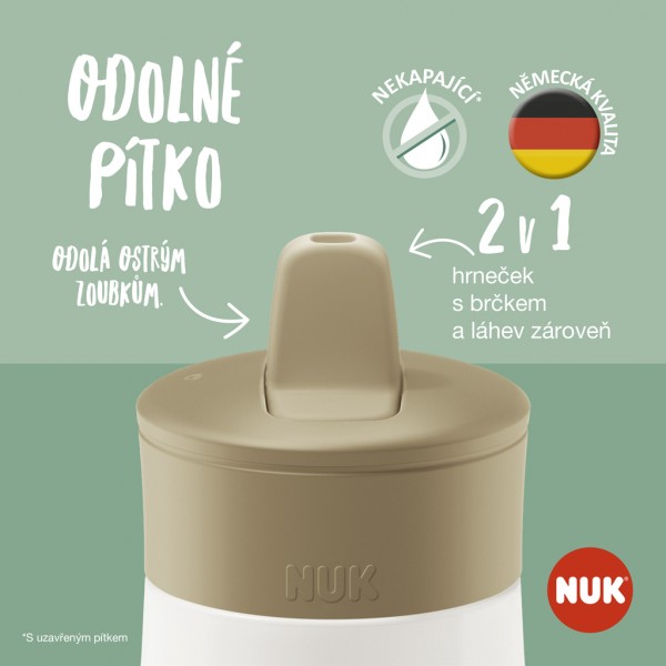 Fľaša NUK Peppa Pig Mini-Me Flip, s náustkom 2v1 odolným proti hryzeniu, netečúca, 450 ml, od 12 mesiacov.Vlastnosti:- Športová fľaša pre každé dobrodružstvo - pre deti od 12 mesiacov- Pítko 2v1 odolné proti hryzeniu - hrnček so slamkou a fľaša zároveň- Fľaša na pitie v modernom dizajne – vyrobená z 80 % z udržateľných materiálov- Vhodná na umývanie v umývačke riadu, netečúca, s ochranným viečkom na cesty- Možno kombinovať so všetkými produktmi z radu NUK Mini-Me, objem 450 ml, neobsahuje BPA- Prasiatko Peppa oslavuje narodeniny a NUK blahoželá vydaním limitovanej edície!Ponorte sa do veselého sveta prasiatka Peppy. Objavte limitovanú edíciu NUK, ktorá bola uvedená na trh špeciálne k narodeninám tohto roztomilého prasiatka. So svojim bratom Georgom zažíva každý deň vzrušujúce príbehy. Či už zbiera kvety alebo sa hrá na slniečku, s Peppou je každý deň veľkým dobrodružstvom. Objavte hravé motívy limitovanej kolekcie Prasiatka Peppy!Dôležité pokyny pre používanie Pred prvým použitím rozložte výrobok podľa návodu na jednotlivé diely, tie vyčistite a na 5 minút umiestnite do vriacej vody. Slúži to na hygienické účely. Pred každým ďalším použitím starostlivo vyčistite. V prípade potreby sterilizujte. Uchovávajte v suchu a hygienicky. Pri vyváraní alebo naparovaní fľašu vždy rozložte na jednotlivé diely a nechajte otvorené, pretože inak môže dôjsť k ich deformáciám. Pri naparovaní odporúčame použiť parný sterilizátor NUK. Na zabránenie poškodeniu materiálu vždy dodržujte návody na použitie odparovača. Pri dezinfekcii plastových fliaš nesmie byť prekročená maximálna teplota 100°C (pokyn na fľaši). Cumlík na kŕmenie alebo fľašu nikdy nevystavujte priamemu slnečnému žiareniu alebo teplu alebo ju nenechávajte dlhšie ako je uvedené v dezinfekčnom prostriedku (sterilizačný roztok), môže to znížiť pevnosť cumlíka alebo poškodiť materiál. Pre Mini-Me Flip z PP: Fľaše vždy ohrievajte otvorené (nebezpečenstvo výbuchu) a ochlaďte (deformácia)! Pri ohrievaní v mikrovlnnej rúre je dôležitá opatrnosť; môže dôjsť k miestnemu prehriatiu. Ohriate potraviny sa musia vždy premiešať a pred kŕmením sa musí skontrolovať teplota. Pre Mini-Me Flip z ušľachtilej ocele: Fľaša z ušľachtilej ocele sa nesmie používať v mikrovlnnej rúre (nebezpečenstvo výbuchu/poškodenie materiálu). Fľašu nenapĺňajte nápojmi sýtenými oxidom uhličitým alebo príliš horúcimi nápojmi. Môže vzniknúť pretlak, ktorý môže viesť k vytečeniu tekutiny. V priestoroch s podtlakom (napr. v lietadlách) sa môžu vyskytovať netesnosti. Pri plnení nápojom pripraveným z instantného prášku dbajte na to, aby sa prášok úplne rozpustil. Usadeniny alebo ovocná dužina môžu zhoršiť funkciu silikónového tesniaceho krúžku. Pri preprave zaklapnite náustok a nasaďte kryt. Pre bezpečnosť a zdravie Vášho dieťaťaUPOZORNENIE! Neustále a dlhodobé sanie tekutín spôsobuje zubný kaz. K poškodeniu zubnej substancie môže u malých detí dôjsť aj vtedy, ak konzumujú tekutiny bez cukru. Pred kŕmením vždy skontrolujte teplotu jedla. Pri prvom náznaku poškodenia alebo opotrebovania výrobok vyhoďte. Nepoužívané súčasti výrobku uchovávajte mimo dosahu detí. Nikdy nespájajte so šnúrami, stuhami, šnúrkami alebo s voľnými časťami oblečenia, mohlo by dôjsť k uškrteniu dieťaťa. Používajte tento výrobok vždy pod dohľadom dospelých. Nikdy nepoužívajte cumlík na kŕmenie ako bežný cumlík. Fľaša je vhodná pre deti od 12 mesiacov a nesmie byť používaná na kŕmenie malých bábätiek. Jednotlivé diely uchovávajte mimo dosahu detí:– hrozí nebezpečenstvo prehltnutia,– hrozí privretie prstov. Pri nadstavci na pitie vždy skontrolujte známky použitia. Pri viditeľnom poškodení ho vymeňte. Ak fľaša vykazuje na vnútornej strane poškodenie (napr. škrabance), musí byť z hygienických dôvodov vymenená.Uchovávajte hygienicky a v suchu. Fľaštičky a nástavce na pitie NUK je možné kombinovať iba s príslušnou produktovou sériou.Čistenie1. Pri čistení produkt rozložte na jednotlivé diely A–F. Demontáž ochranného krytu a jeho prídržného krúžku viď obr. 1 (Rada: Položte prst na záves ochranného viečka a mierne stlačte smerom dole). Na uvoľnenie doštičky adaptéra otvorte/postavte náustok a vtlačte zhora na doštičku adaptéra.2. Jednotlivé časti umyte v teplej vode. V prípade potreby ich nechajte vo vode chvíľu odmočiť. Opláchnite čistou vodou a otrepte. Pred opätovným zostavením nechajte uschnúť.3. Fľaštičku na pitie skladujte hygienicky, v suchu a chránenú pred svetlom. Všetko skladujte rozložené na jednotlivé diely a otvorené.Upozornenie: Pre Mini-Me Flip z PP: Fľaša je tiež vhodná na umývanie v umývačke riadu. Pri čistení v umývačke riadu môže dôjsť k poškodeniu materiálu agresívnymi čistiacimi prostriedkami. Niektoré potraviny môžu spôsobiť zafarbenie materiálu (napr. mrkvová šťava) alebo spôsobiť zápach (napr. feniklový čaj). To neobmedzuje vhodnosť použitia. Pri čistení nepoužívajte špicaté predmety (nebezpečenstvo poškodenia)! V prípade viditeľných usadenín namočte doštičku adaptéra, náustok alebo okraj na pitie do vody s prípravkom na umývanie riadu na cca 10 minút a následne opláchnite v čistej vode.V prípade potreby vyvarte.Výrobca: MAPA GmbH, Industriestraße 21 -25, 27404 Zeven, Nemecko. Spontexsk@newellco.com, info@nuk.cz, www.nuk.com.