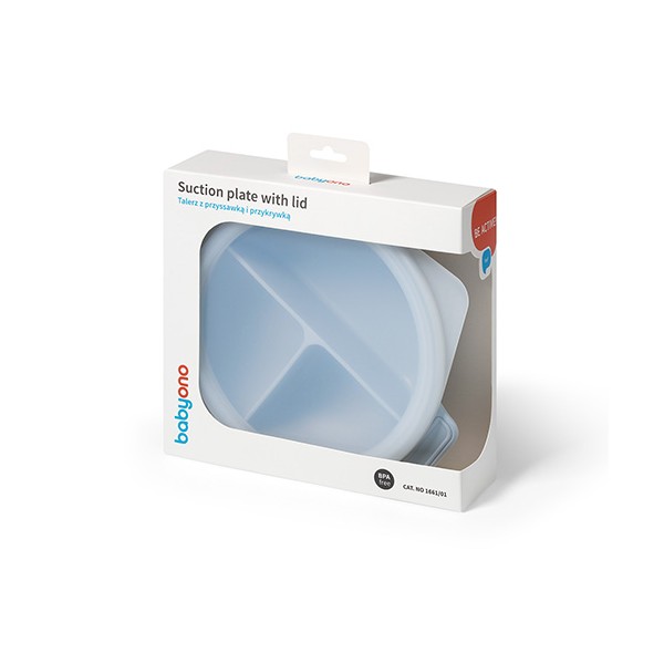 BABYONO Tanier silikónový s prísavkou a viečkom modrý 6m+
