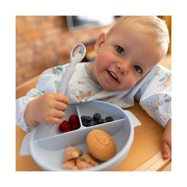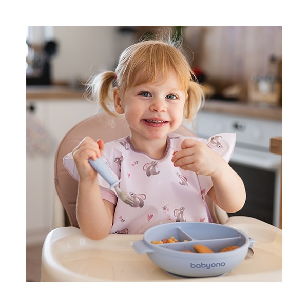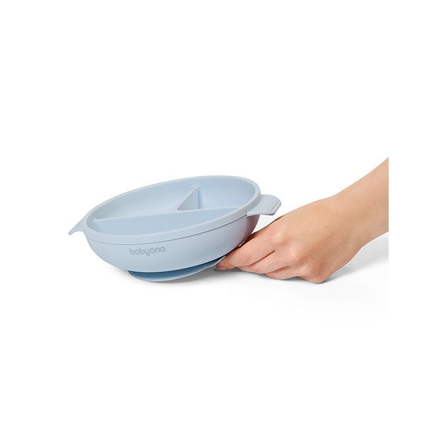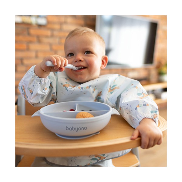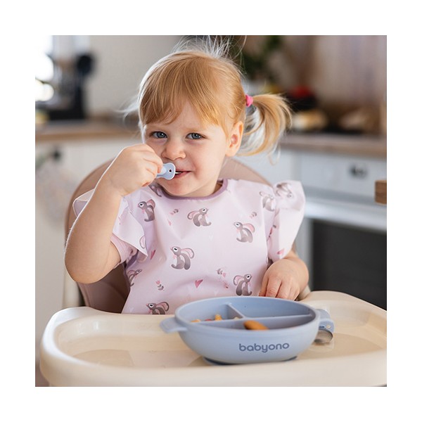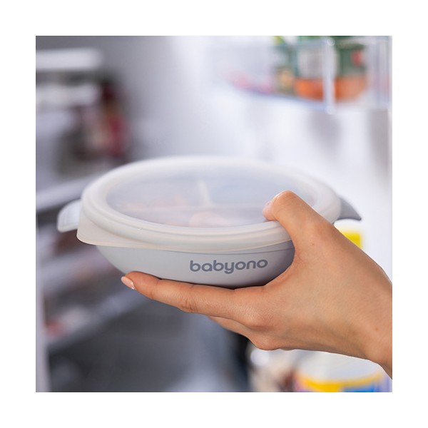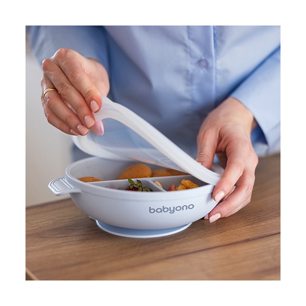 Silikónový tanier s prísavkou a viečkom – bezpečné a zábavné jedenie bez neporiadku.Zavádzate do jedálnička svojho bábätka tuhé jedlo alebo skúšate metódu BLW? Tento silikónový tanierik s tromi priehradkami vám to výrazne uľahčí. Umožní dieťaťu ochutnávať nové chute, podporuje samostatné kŕmenie a vďaka prísavke udrží tanier pevne na mieste – bez rizika prevrátenia. Viečko udrží jedlo teplé a čerstvé, takže môžete pripraviť jedlo vopred alebo uschovať zvyšky na neskôr. Tri samostatné priehradky umožňujú servírovať rôzne druhy jedál bez miešania chutí. Zaoblené okraje a vyššie steny uľahčujú naberanie jedla, či už rukou alebo príborom. Tanier aj viečko sú vyrobené z odolného, netoxického silikónu bez BPA, ktorý môžete používať v mikrovlnnej rúre aj umývačke riadu.Vlastnosti:- ideálny pri zavádzaní tuhej stravy a metóde BLW – podporuje zdravé stravovacie návyky- stabilná prísavka udrží tanier pevne na stole – zabraňuje prevráteniu a neporiadku- ergonomický tvar so zaoblenými okrajmi a vyššími stenami – jednoduché naberanie jedla- tri priehradky – umožňujú oddeliť jedlo a chutí sa dieťa učí spoznávať každú zvlášť- silikónové viečko – udrží jedlo teplé a čerstvé, ideálne aj na uskladnenie zvyškov- praktické protišmykové rukoväte – bezpečné prenášanie aj s teplým jedlom- vyrobené z odolného, netoxického silikónu bez BPA – nerozbije sa, nepraskne- vhodné do mikrovlnnej rúry a umývačky riadu – jednoduchá údržba- materiál neabsorbuje pachy a nefarbí saTechnické údaje:- materiál: 100 % silikón bez BPA- vek dieťaťa: od 6 mesiacov- rozmery: 17 × 21 cmRozmer balenia: 20 x 3 x 23 cmDôležité: Odstráňte všetky prvky, ktoré by mohli byť pre dieťa nebezpečné. Pred každým použitím skontrolujte stav výrobku. Pri prvých známkach poškodenia alebo opotrebovania ho vymeňte. Vždy používajte pod dohľadom dospelej osoby – výrobok nie je hračka. Obal si uchovajte na informačné účely. Uchovávajte mimo dosahu detí. Pred prvým použitím prelejte tanier vriacou vodou (nevariť!) a osušte. Po umytí v umývačke výrobok hneď vyberte a osušte – ponechanie v umývačke môže spôsobiť deformácie.Adresa dodávateľa: Babyono sp. z o.o., Kowalewicka 13, 60-002 Poznań, Poland. +48 61 83 90 520, info@babyono.pl, www.babyono.com