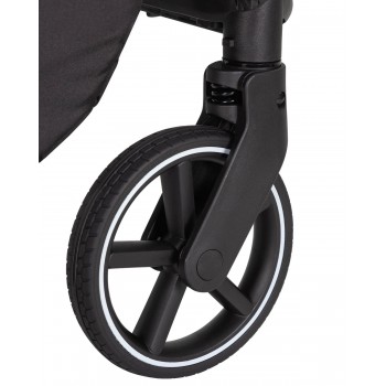 Citlivé dvojité brzdy a mäkké pružinové odpruženie s nastaviteľnou tuhosťou. Odolné gumené kolesá s priľnavým dezénom a predné kolesá sa automaticky zablokujú praktickým spínačom.