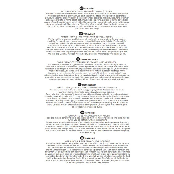 Od amatéra k profesionálovi / Od trojkolky k bicykluMultifunkčná trojkolka určená pre deti od 1,5 do 5 rokov alebo do 25 kilogramov. Je to nielen dopravný prostriedok na presun a učenie sa rovnováhy, ale aj spoločník pre rastúce dieťa počas mnohých vývojových fáz. Premyslené menenie sa bicykla sa prispôsobuje potrebám dieřatka podľa toho, ako sa vyvíjajú jeho motorické schopnosti. Spočiatku je to trojkolka s možnosťou asistencie rodiča, zatiaľ čo konečná verzia je štandardný bicykel s pedálmi, bez akýchkoľvek ďalších podporných prvkov. Vďaka takýmto zmenám môžete pomôcť svojmu dieťaťu naučiť sa jazdiť na dvoch kolesách. Jedinečnou vlastnosťou bicykla je jeho multifunkčnosť, vďaka ktorej ho môžete používať v piatich rôznych režimoch v závislosti od veku a zručností dieťatka:- Režim tlačenie trojkolky - pre vek 1,5 - 2 roky - Režim trojkolky na posúvanie - pre vek 1,5 - 2 roky - Režim trojkolky s pedálmi - pre vek 2 - 3 roky - Režim balančného bicykla - pre vek 3 - 4 roky - Režim bicykla s pedálmi - pre vek 4 - 5 rokov Riadidlá s protišmykovými gumovými rukoväťami sú nastaviteľné, pedále sú odnímateľné a sedlo sa prispôsobí výške, pričom vďaka nastaviteľným bezpečnostným pásom je zaistená maximálna bezpečnosť. Vďaka odolným gumovým kolesám je bicykel ideálny pre dvoj- aj trojkolesové verzie, ktoré zaručujú stabilitu na rôznych povrchoch. Jednoduchý systém transformácie z jedného režimu na druhý nevyžaduje náradie a umožňuje rýchle zmeny podľa veku a zručností dieťatka. Napriek rozsiahlej funkčnosti zostáva ľahký a praktický, váži len 5,6 kg a má kompaktné rozmery:- v trojkolesovej verzii má dĺžku 67 cm, šírku 46 cm a nastaviteľnú výšku sedla od 31 do 37 cm. Vlastnosti:- 5 režimov v závislosti od veku a zručností dieťaťa - nastaviteľné riadidlá s gumovými rukoväťami - odnímateľné pedále - nastaviteľné sedlo s bezpečnostnými pásmi - odolné gumové kolieska - jednoduchý systém transformácie do iného režimu - určené pre deti od 1,5 do 5 rokov alebo do 25 kg. - dĺžka: 67 cm - šírka (trojkolesová verzia): 46 cm - výška (sedlo): 31-37 cm - hmotnosť výrobku: 5,6 kgNa výstave Kids'Time 2024 v poľskom meste Kielce získalo Turbo prestížnu cenu Kids'Time Star v kategórii Najlepšia hračka pre deti do 3 rokov.Adresa dodávateľa:ags 92, s.r.o., Drahobejlova 2515/18, 190 00 Praha, Česká republika info@petiteetmars.comUPOZORNENIE! Montáž musí vykonávať dospelá osoba! Pred použitím si pozorne prečítajte návod na obsluhu a uschovajte si ho pre budúce použitie. Pri nedodržaní týchto pokynov môže dôjsť k zraneniu dieťaťa. Pred použitím odstráňte a zlikvidujte všetky plastové vrecká a obaly a uchovávajte ich mimo dosahu detí. Používajte produkt opatrne, pretože je potrebná zručnosť, aby sa predišlo pádom alebo kolíziám, ktoré by spôsobili zranenie používateľa alebo tretích osôb. Nikdy nenechávajte dieťa bez dozoru. Dieťa majte vždy na očiach. Táto trojkolka je vhodná pre deti od 1,5 do 5 rokov, nie je určená pre deti mladšie ako 1,5 roka. Výrobok nie je vhodný pre deti s hmotnosťou vyššou ako 25 kg.