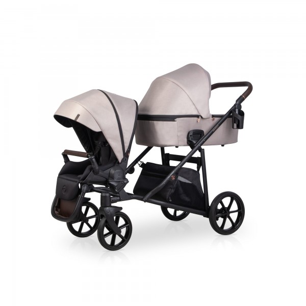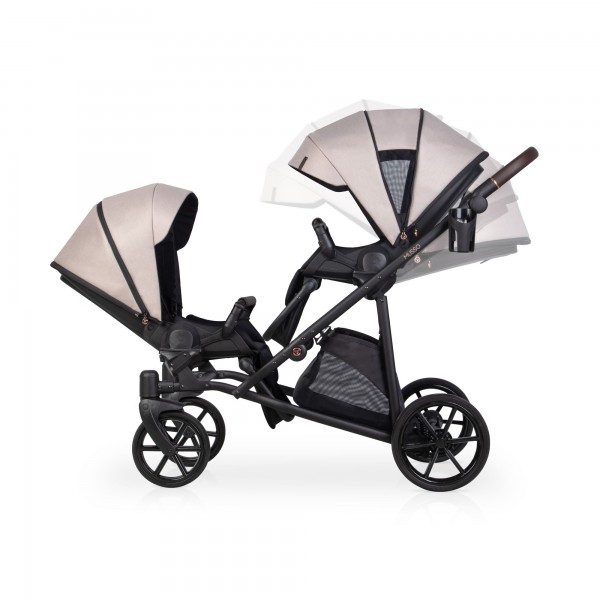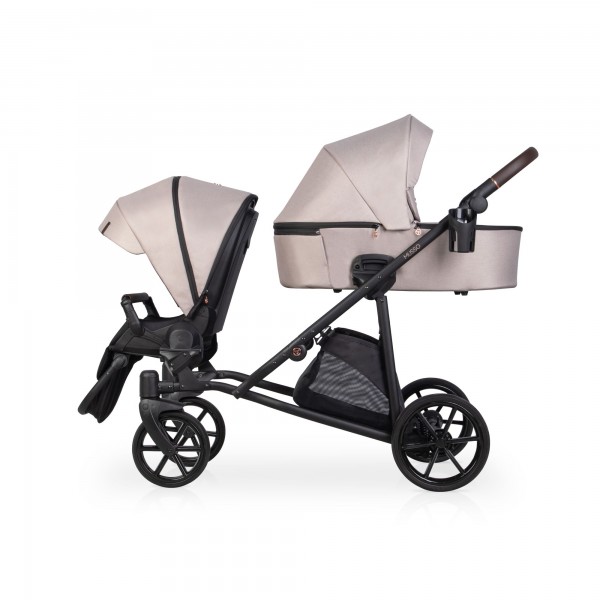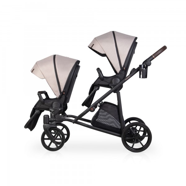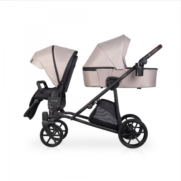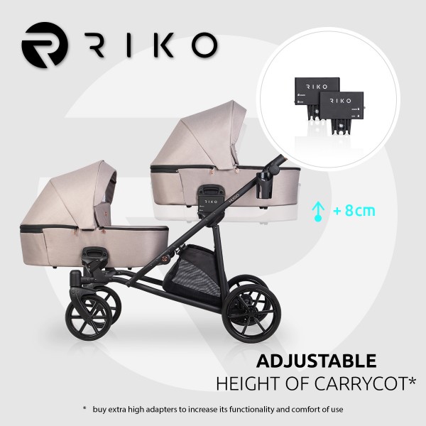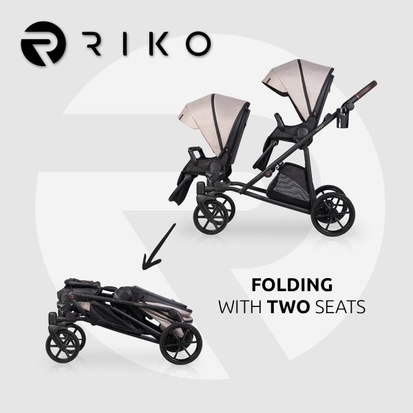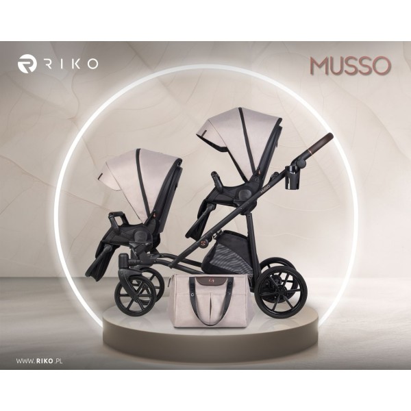 Wózek dziecięcy dla bliźniąt lub dzieci rok po roku MUSSO marki RIKO – dla dwójki dzieci Firma RIKO jest jednym z wiodących producentów wózków dziecięcych w Europie. Ponad 20 letnie doświadczenie w produkcji wózków dziecięcych owocuje coraz to nowocześniejszymi i lepszymi produktami. W roku 2024 marka RIKO przeszła całkowitą metamorfozę rozpoczynając produkcję wózków klasy premium z najwyższej jakości materiałów i w najwyższym dostępnym na rynku standardzie wykończenia. Produkty są nowoczesne i funkcjonalne, a ich jakość gwarantuje własny park maszyn do testów wytrzymałościowych i doświadczony zespół kontrolerów jakości. Wózek dziecięcy dla dwójki dzieci MUSSO marki RIKO może być zarówno wózkiem dla bliźniąt jak i dwójki dzieci w różnym wieku do wagi 22 kg. Wersja podstawowa to stelaż z dwoma siedziskami spacerowymi przeznaczonymi dla dzieci od 6 miesięcy do 22 kg. Dodatkowo można dokupić jedną lub dwie gondole, tworząc w ten sposób wózek wielofunkcyjny 2 w 1 dla bliźniąt (z dwiema gondolami i dwoma siedziskami) lub dla dzieci rok po roku (z jedną gondolą i jednym siedziskiem). Rozszerzając zestaw o jeden lub dwa foteliki samochodowe RIKO COSMO by AVIONAUT otrzymujemy wózek w wersji 3 w 1. Dzięki możliwości zastosowania uniwersalnych adapterów do fotelików samochodowych dla dzieci z grupy wzrostowej 40-87 cm, w wózku MUSSO można zainstalować foteliki samochodowy innych znanych marek, które posiadają tak zwane uniwersalne wpięcia typu „Maxi Cosi”. Wózek dziecięcy typu tandem RIKO MUSSO umożliwia aż 16 różnych konfiguracji siedzisk spacerowych, gondoli i fotelików samochodowych. Możliwe jest ustawienie dwóch siedzisk przodem i tyłem do kierunku jazdy, jak również przodami do siebie lub tyłami do siebie. MUSSO marki RIKO jako jeden z niewielu wózków na rynku umożliwia również dowolną konfigurację połączenia jednej gondoli z jednym siedziskiem spacerowym włącznie z możliwością montażu siedziska na przednim module przodem do kierunku jazdy, podczas gdy gondola zamontowana jest na tylnym module. Oczywiście na stelażu wózka można równocześnie przewozić dwie gondole lub dwa foteliki samochodowy. Opcjonalnie do wózka MUSSO można również dokupić adaptery podwyższające, które dodatkowo zwiększą jego funkcjonalność i komfort użytkowania. Adaptery umożliwiają zwiększenie dystansu między modułami, co będzie przydatne zwłaszcza podczas korzystania z wersji z dwiema gondolami lub dwoma siedziskami. Przy takich połączeniach zastosowanie adapterów podwyższających na tylnym module zwiększy prześwit i zapewni wygodniejszy dostęp do dzieci. Wózek dla dwójki dzieci RIKO MUSSO można złożyć razem z dwoma siedziskami do niewielkich jak na ten typ wózka rozmiarów. Również waga wózka nie jest wysoka jak na wózek podwójny typu tandem. Sam stelaż wózka razem z kołami waży zaledwie 9,5 kg co jest doskonałym wynikiem. Siedziska składane „w kanapkę” oraz składane na płasko gondole pomogą zmieścić wózek w bagażniku samochodu. Gondole do wózka dziecięcego RIKO MUSSO są różne dla przedniego i tylnego modułu. Wybierając wersję wózka z jedną gondolą, należy określić w zamówieniu, czy wybieramy gondolę do przedniego (dolnego) czy tylnego (górnego) modułu. Gondole posiadają inne rozmieszczenie adapterów, dzięki czemu możliwa jest większa liczba konfiguracji wózka. Dzięki dwóm dużym panelom wentylacyjnym gondole doskonale sprawdzą się w ciepłe letnie dni umożliwiając cyrkulację powietrza. Przedni panel wentylacyjny z siateczką spełni również funkcję okienka dla dziecka. Oba panele są szczelnie zamykane suwakami, więc gondole są całoroczne. W zestawie z wózkiem w wersji podstawowej otrzymujesz stelaż z kołami i koszem, dwa siedziska spacerowe, dwa ocieplacze na nóżki, dwie folie przeciwdeszczowe, dwie moskitiery, dwie barierki zabezpieczające oraz dużą stylową torbę z systemem mocowań do rączki wózka. Do wózków dziecięcych RIKO dedykowany jest fotelik samochodowy RIKO COSMO produkowany w systemie Dual Branding przez renomowanego producenta fotelików samochodowych Avionaut. Fotelik posiada obowiązującą od września 2023 nową europejską homologację R129 i jest również dostępny w wersji I-SIZE z bazą ISOFIX DOCK 2 marki Avionaut. Dzięki możliwości zakupu adapterów uniwersalnych na stelażu wózka można również montować foteliki samochodowe innych marek, jeśli posiadają uniwersalne wpięcia typu „Maxi Cosi” (o szczegóły zapytaj sprzedawcę). SPECYFIKACJA TECHNICZNA: - wózek wielofunkcyjny dla dzieci od narodzin do 22 kg zgodny z normą EN 1888-1:2018 i EN 1888-2:2018, - wózek dziecięcy typu tandem przeznaczony dla bliźniąt lub dwójki dzieci w różnym wieku nie przekraczających wagi 22 kg, - dwa pełnowymiarowe siedziska z możliwością montażu w obu kierunkach, - możliwość złożenia wózka razem z dwoma siedziskami, - możliwość zamontowania jednej lub dwóch gondoli dla dzieci do 9 kg, - możliwość zamontowania jednego lub dwóch fotelików samochodowych RIKO COSMO by AVIONAUT lub innych fotelików dla grupy 40-87 cm posiadających tzw. uniwersalne wpięcia typu „maxi cosi”, - aż 16 różnych konfiguracji wózka (w zależności od wybranej wersji), - regulacja wysokości rączki, - hamulec postojowy obsługiwany naciśnięciem od góry, - możliwość złożenia gondoli na płasko, - panel wentylacyjny w gondoli, - bawełniana wyściółka gondoli, - pięciopunktowe pasy bezpieczeństwa z magnetyczną klamrą, - rączka i barierka obszyte wysokiej jakości skórą ekologiczną, - uchylna barierka, - system amortyzacji wszystkich kół, - regulacja twardości zawieszenia tylnych kół, - lekkie koła z oponami żelowymi (poliuretan), - kosz pod wózkiem, - torba mocowana do rączki wózka, - skrętne przednie koła z blokadą do jazdy prosto, - czter