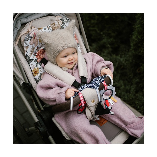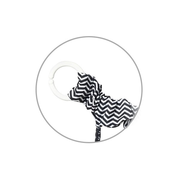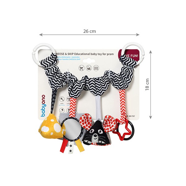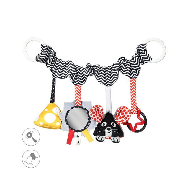 Kontrastná edukačná senzorická hračka pomáha stimulovať hmat a zrak, rovnako aj rozvoj motoriky dieťatka. Upevnite hračku na kočík, postieľku alebo autosedačku, aby sa dieťatko zabavilo pri prechádzke alebo cestovaní. Na časti potiahnutej jemnou látkou sú zavesené štyri predmety: štrkajúci žltý kúsok syra, bezpečné zrkadielko s farebnými stužkami, myš so šuštiacimi uškami a obrys kruhu a hviezdy. Zaujímavý výber prvkov podnecuje objavovanie a priťahuje pozornosť dieťatka svojím rozmanitým dizajnom a vysokým kontrastom farieb. Bábätko sa bude hrať, objavovať svet a zároveň zdokonaľovať koordináciu ruka-oko.Funkčný klipHračku je možné namontovať na kočík, autosedačku alebo postieľku pomocou všestranného klipu.HrkálkaJemný zvuk hrkálky v myške a syre priťahuje pozornosť dieťatka, upokojuje a uvoľňuje.Šuštiace prvkyŠuštiace kúsky ukryté v ušiach myši sú pre bábätko zaujímavé a príťažlivé, podporujú kognitívne schopnosti.Bezpečné zrkadielkoDieťa bude môcť vidieť svoj vlastný odraz v zrkadielku z pružného materiálu. Farebné štítky obklopujúce zrkadlo priťahujú extra pozornosť.Rôzne textúry materiálovTým, že necháte dieťatko dotýkať sa, skúmať a porovnávať textúry, dáte mu zmyslovú stimuláciu a obohatíte jeho vnímanie.Technické vlastnostiMateriál: 100% polyesterRozmery: 26 x 18 cmVek bábätka: 0m+