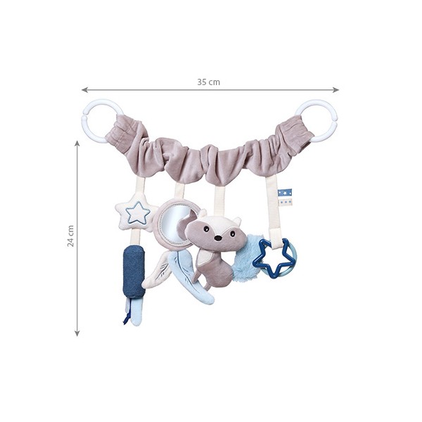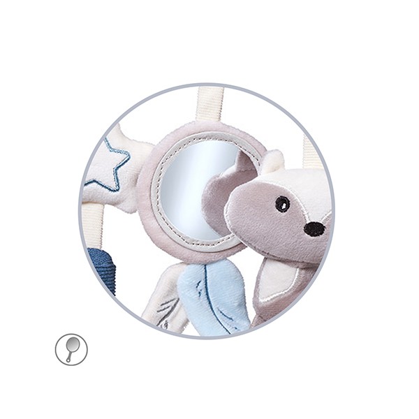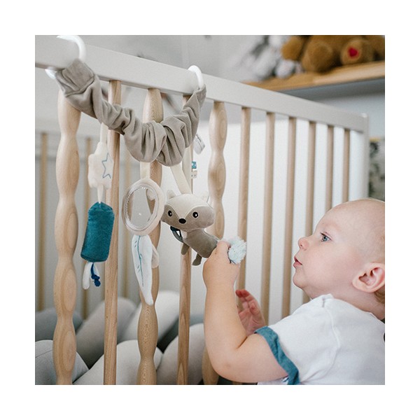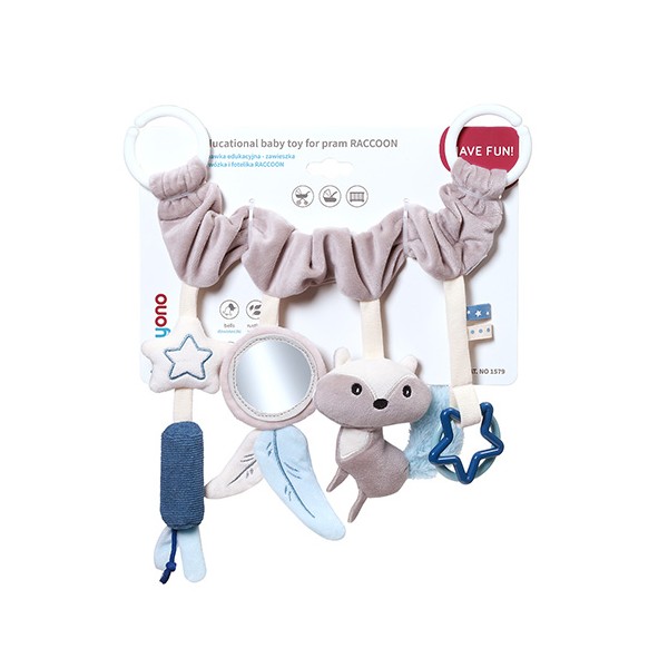 Závesná hrazdička Raccoon do kočíka a autosedačky je senzorický produkt, ktorý dokáže stimulovať hmat a zrak dieťaťa, ako aj zlepšiť jeho motorické schopnosti. Všetko, čo musíte urobiť, je pripevniť ho na kočík, kolísku alebo autosedačku, aby ste dieťa zabavili počas prechádzok a cestovania. Závesný predmet potiahnutý látkou príjemnou na dotyk je dodávaný s pôvabným medvedíkom čistotným, bezpečným zrkadielkom, príjemnými zvončekmi, ako aj s prsteňom a hviezdou. Starostlivo vybrané kúsky sú atraktívne a upútajú pozornosť dieťaťa. Váš drobec sa môže hrať, objavovať svet a rozvíjať svoje oči a sluch.Praktické uchytenie:- Pomocou praktického a univerzálneho úchytu pripevníte hračku ku kočíku, autosedačke aj postieľke.Malé zvončeky:- Zvončeky pri pohybe vydávajú príjemný a jemný zvuk. Úlohou tohto zvuku je uvoľniť dieťatko počas prechádzok.Šuštacia hračka:- Šuštiace kúsky ukryté v chvoste a liste medvedíka čistotného zaujmú vaše dieťatko a pritiahnu jeho pozornosť a súčasne rozvíjajú jeho kognitívne schopnosti.Bezpečné zrkadlo:- Flexibilné zrkadlo umožní vášmu dieťatku vidieť svoj vlastný odraz. Rôzne textúry:- Tým, že necháte svoje dieťa dotýkať sa rôznych textúr, poskytnete a obohatíte jeho zmyslové zážitky.Vzdelávacia hra:- Keďže sú kúsky rôznorodé, hra s bábätkom je kreatívna. Technické vlastnosti:- Materiál: 100% polyester- Rozmer: 35 cm x 24 cm- Vek bábätka: 0 m+Bezpečnostné informácie:- Pripevnite hračku mimo dosahu dieťaťa. Aby ste predišli možným zraneniam zo zamotania, odstráňte hračku, keď sa dieťa začne pokúšať postaviť na ruky a kolená v polohe plazenia.- Odstráňte z hračky všetky bezpečnostné prvky, ktoré môžu byť pre dieťa nebezpečné.- Pred každým darovaním hračky dieťaťu skontrolujte jej kvalitu. Iba nepoškodená hračka zaručí vášmu dieťatku bezpečné používanie. Hračku zlikvidujte hneď, ako spozorujete prvé známky poškodenia.- Odporúča sa hrať pod dohľadom dospelej osoby.- Hračka spĺňa normu EN 71.- Odporúčame, aby ste si obal odložili pre referenciu. Balenie uchovávajte mimo dosahu detí. Obal a spojovacie prvky nie sú hračkou a môžu predstavovať zdravotné riziko pre dieťa.Dodávateľ: Babyono sp. z o.o., Kowalewicka 13, 60–002 Poznań, Poland. +48 61 83 90 520, info@babyono.pl, www.babyono.comDodávateľ: ags 92, s.r.o., Drahobejlova 2515/18, 190 00 Praha Česká republika info@petiteetmars.com