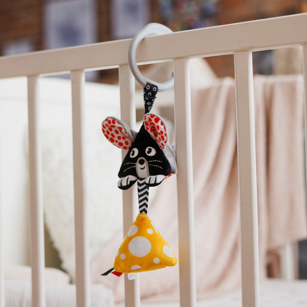 Závesná kontrastná hračka v podobe myšky uvedie vaše dieťa do sveta prvých farieb, zvukov a textúr. Pripevnite ju na postieľku, kočík alebo autosedačku.Hrkajúci syr a myška spolu so šuštivými uškami stimulujú sluch a zoznamujú dieťa s rôznymi zvukmi. Farebné visačky a kučeravý chvostík podporujú uchopenie a zručnosť prstov.Táto čiernobiela hračka do kočíka so žltými a červenými akcentmi a geometrickými vzormi úžasne stimuluje zrak od prvých mesiacov života.Vyrobené z bezpečných, mäkkých materiálov a navrhnuté pre malé ručičky, rozvíja fantáziu, zmysly a jemnú motoriku vášho dieťaťa. CHRAŠTÍTKO MYŠKAVlastnosti:- Hračka obsahuje hrkálky, ktoré vydávajú príjemné zvuky – hlasnejšie pri syre a jemnejšie pri myške. Povzbudzujú pohyb, stimulujú sluch a bavia. Vaše dieťa si zamiluje chytanie, trasenie a počúvanie.- Šuštivé ušká: stačí sa dotknúť myších ušiek a budete počuť zaujímavý šuštivý zvuk. Jemný zvuk povzbudzuje vaše dieťa k preskúmavaniu hračky hmatom a stláčaním. Týmto jemným spôsobom si vaše dieťa rozvíja sluch a zmyslovú citlivosť.- Univerzálny držiak umožňuje zavesiť hračku na kočík, postieľku alebo autosedačku. Ľahko sa pripevňuje a odníma. Je to perfektný spoločník pre vývojové hry doma, na prechádzkach aj na cestách.- Vyčnievajúce stužky v kontrastných farbách as geometrickými vzormi priťahujú pozornosť. Majú zaujímavú textúru, ktorá povzbudzuje k hmatu.- Čiernobiele kontrasty a červené a žlté akcenty sú prvými farbami, ktoré si bábätká všimnú. Stimulujú zrak od prvých mesiacov života.- Hračka umožňuje pohodlné uchopenie a pohyb, podporuje rozvoj jemnej motoriky a koordinácie ruka-oko. Pomáha vášmu dieťaťu rozvíjať jeho fantáziu, zmysly a obratnosť.Bezpečnostné informácie:Odstráňte z hračky všetky bezpečnostné prvky, ktoré by mohli byť pre vaše dieťa nebezpečné. Než hračku dáte dieťaťu, vždy skontrolujte jej stav. Iba nepoškodená hračka zaručuje bezpečné používanie pre vaše dieťa. Hračku zlikvidujte hneď, ako si všimnete prvé známky poškodenia. Odporúča sa dohľad dospelej osoby. Táto hračka spĺňa normu EN 71.Odporúčame uschovať obal na informačné účely. Uchovávajte obal mimo dosahu detí. Obal a zapínanie nie sú hračky a môžu predstavovať riziko pre zdravie vášho dieťaťa.Technické údaje:- materiál: polyester- vek dieťaťa: 0 m+- veľkosť: 27 x 8 cmAdresa dodávateľa: Babyono sp. z o., Kowalewicka 13, 60 – 002 Poznań, Poland. +48 61 83 90 520, info@babyono.pl, www.babyono.com
