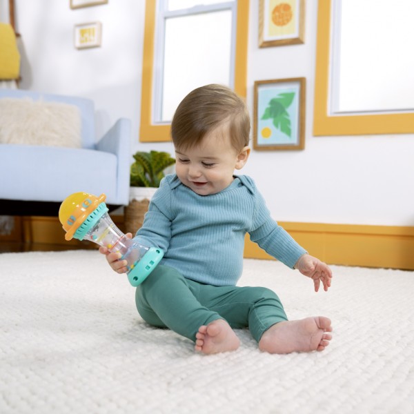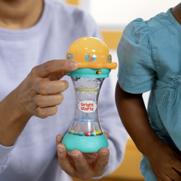 Zaži žiarivú radosť s hračkou Just for Sun od Bright Starts! Svietiaca hračka zabaví bábätko veselými svetlami, zvukmi zvieratiek a hrkajúcimi guľôčkami. Otáčaj slnečnú kupolu, ktorá svieti, a objav viac ako 30 melódií a zvukov – od mňaukania, cez ryčanie až po kvákanie a ďalšie. Pri potrasení sa guľôčky vnútri rozkotúľajú ako kvapky dažďa, čím dieťa získava ďalšiu vizuálnu aj zvukovú stimuláciu. Spodná strana hračky skrýva zrkadielko, ktoré podporuje vnímanie vlastného odrazu a sebaobjavovanie. Táto interaktívna hračka pomáha deťom pochopiť princíp príčiny a následku a je ideálnym spoločníkom na doma aj na cesty.Perfektný darček na oslavu narodenia, Vianoce, či narodeniny!Vlastnosti:- Zábavná hračka so svetlami, zvukmi zvieratiek a hrkajúcimi guľôčkami- Otoč svietiace slniečko a objav 30+ zvukov (mačka, medveď, žaba, opica, vtáčik, lev)- Potras hračkou a sleduj, ako guľôčky padajú ako kvapky dažďa- Spodné zrkadielko pre podporu sebauvedomenia a vizuálnej stimulácie- Podporuje zmyslový vývoj a učenie sa príčiny a následku- Prenosný dizajn vhodný aj na cesty (zmestí sa do väčšiny tašiek na plienky)- Vhodné pre deti od 6 mesiacov- Vyžaduje 2x AAA batériu (súčasťou balenia je batéria pre demo verziu, odporúča sa vymeniť po kúpe)Materiál: – 90% plast a 10% kov.Vekové rozpätie: 6 – 36 mesiacovRozmery produktu: 17,7 cm x 9,7 cm x 9,7 cm Dôležité: Pred odovzdaním výrobku dieťaťu odstráňte všetok obal a upevňovacie prvky. Tento obal a návod na použitie si uschovajte pre budúce použitie – obsahujú dôležité informácie. V rámci neustáleho procesu zlepšovania a inovácie naše výrobky priebežne aktualizujeme.Adresa dodávateľa: KIDS2 EUROPE BV 5 Keizersgracht 287, 1016 ED Amsterdam, Netherlands; +31 20 241 0934.